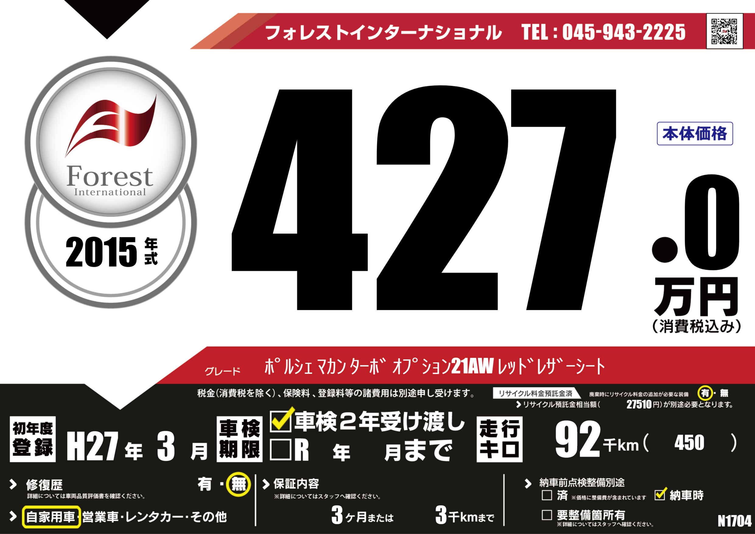 | 走行キロ | 9.2万km | 初年度登録 | H27年3月 |