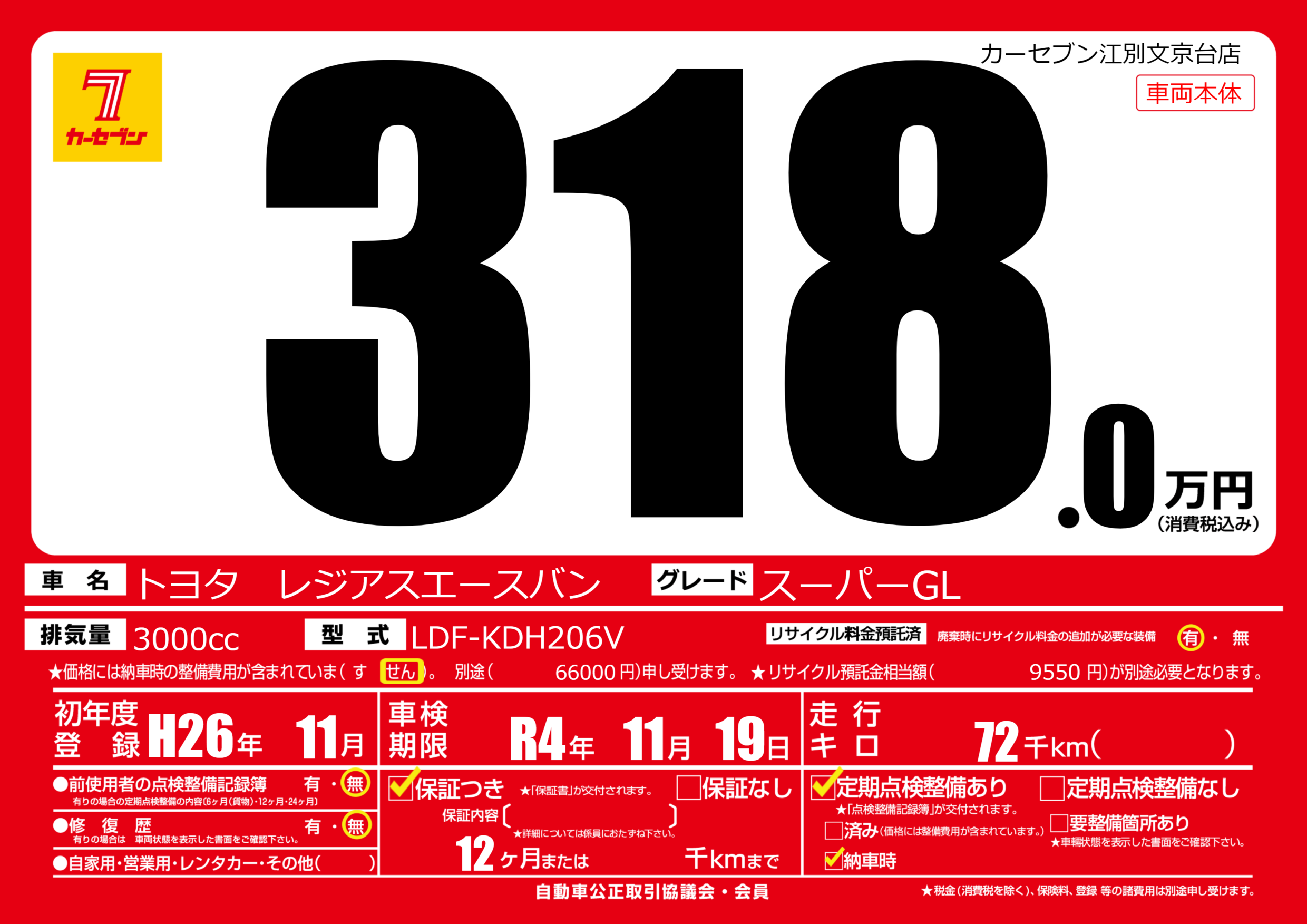 | 車名 | トヨタ レジアスエースバン | グレード ミッション 排気量 |