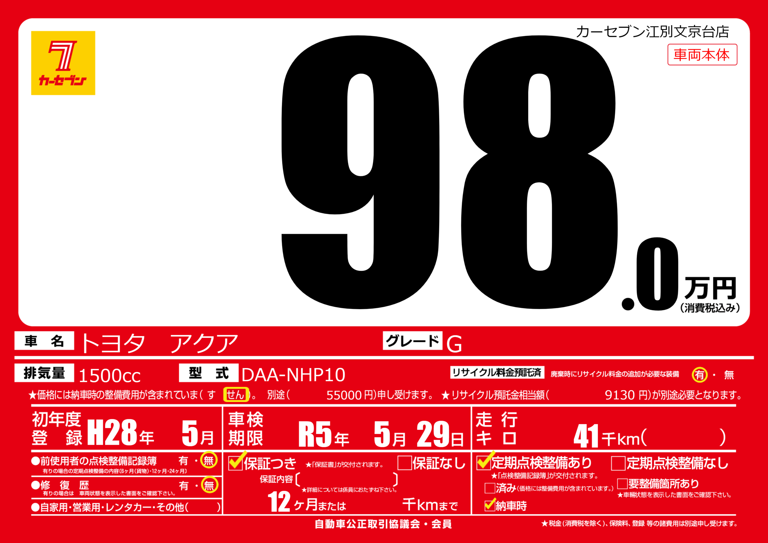 | 車名 | トヨタ アクア | グレード ミッション 排気量 |