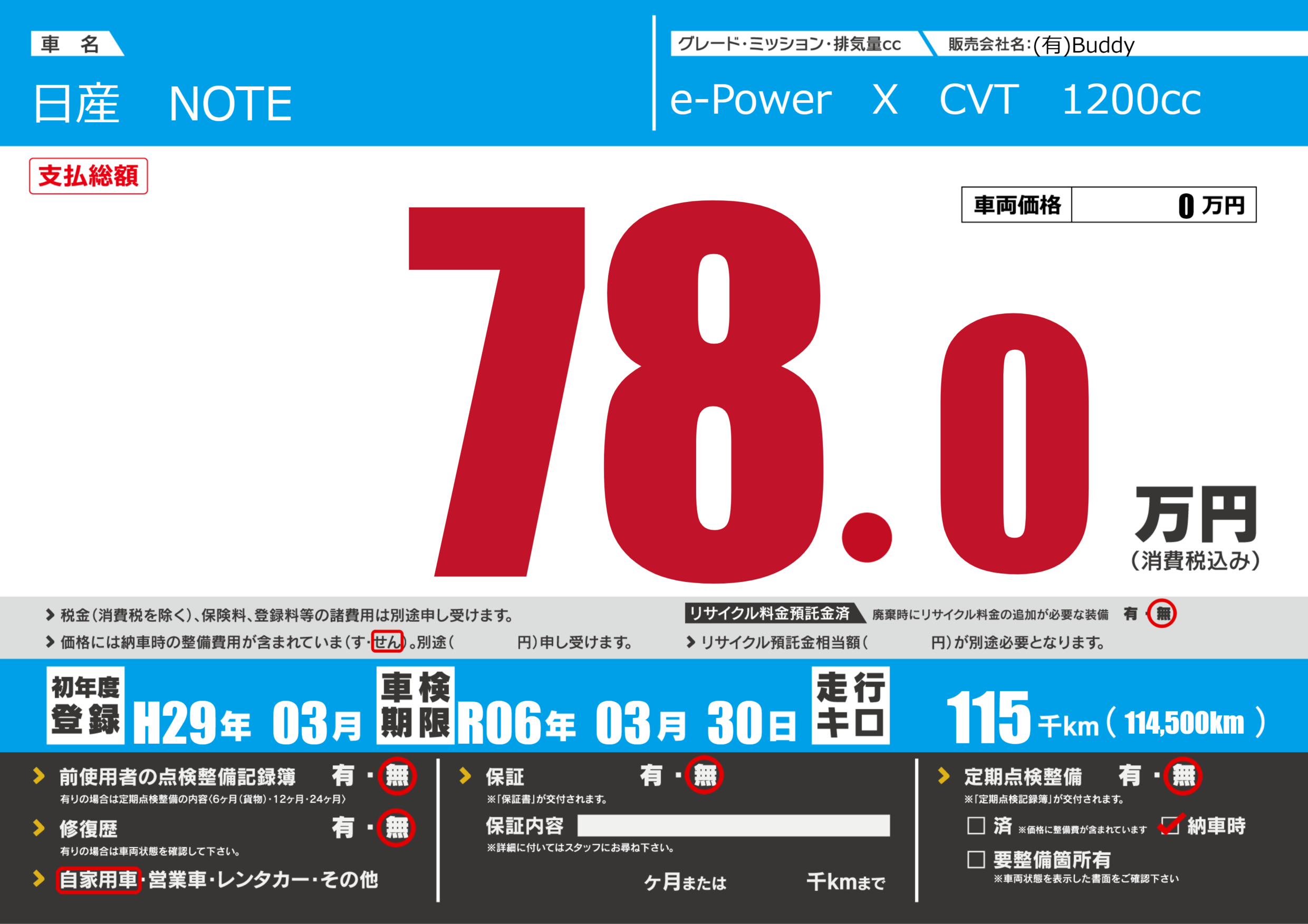 | 定期点検整備 | 定期点検整備なし 納車時あり | ||