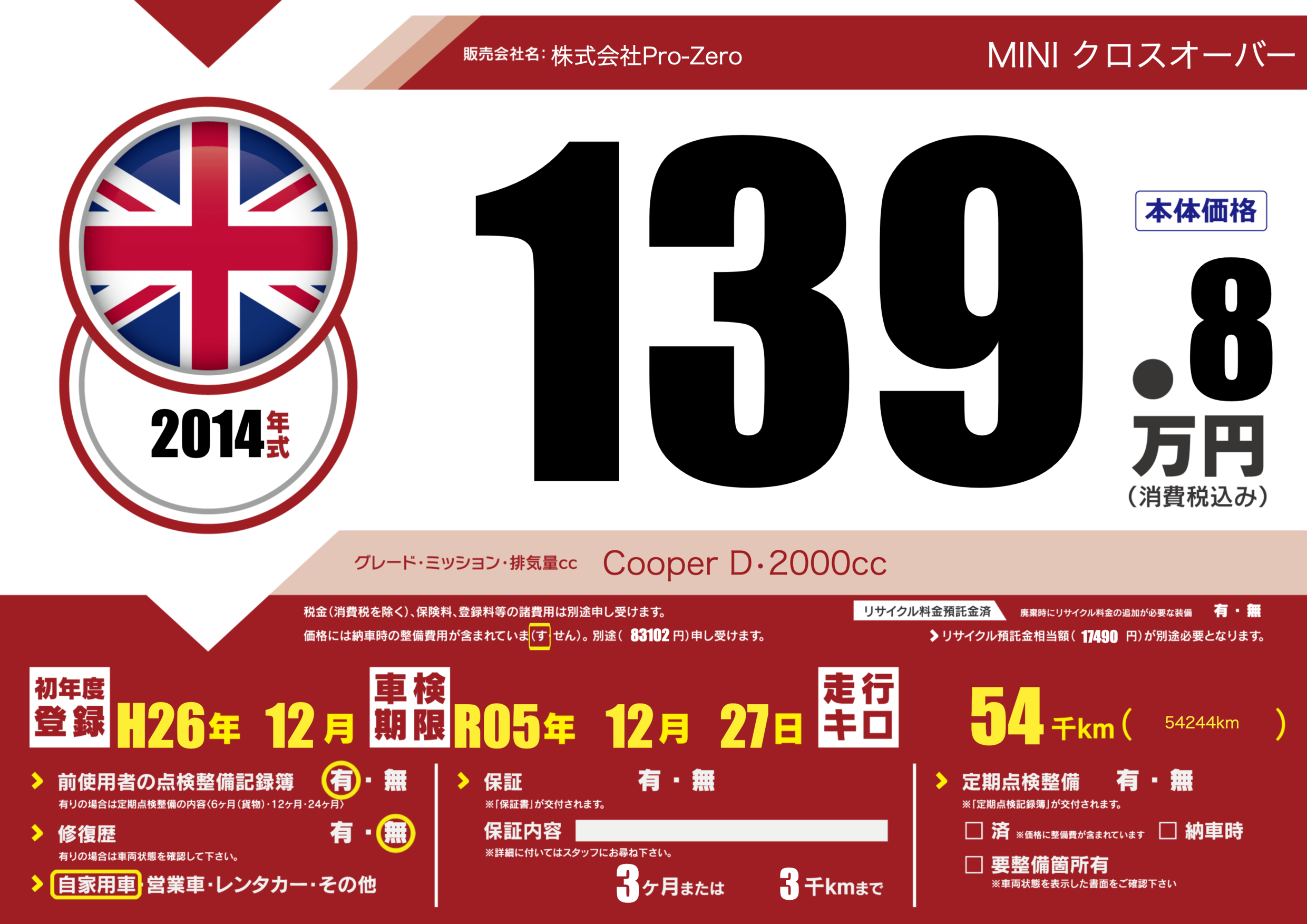 | 車名 | MINI クロスオーバー | グレード ミッション 排気量 |