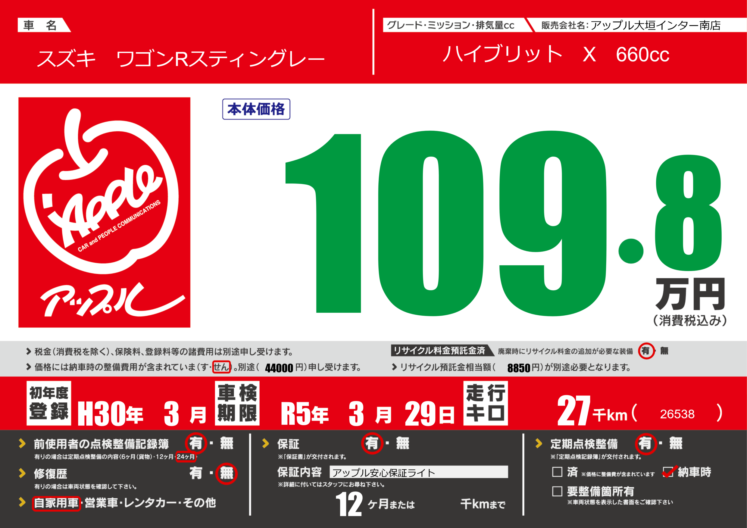 保証付き 保証内容(アップル安心保証ライト) 12ヶ月または()千kmまで |