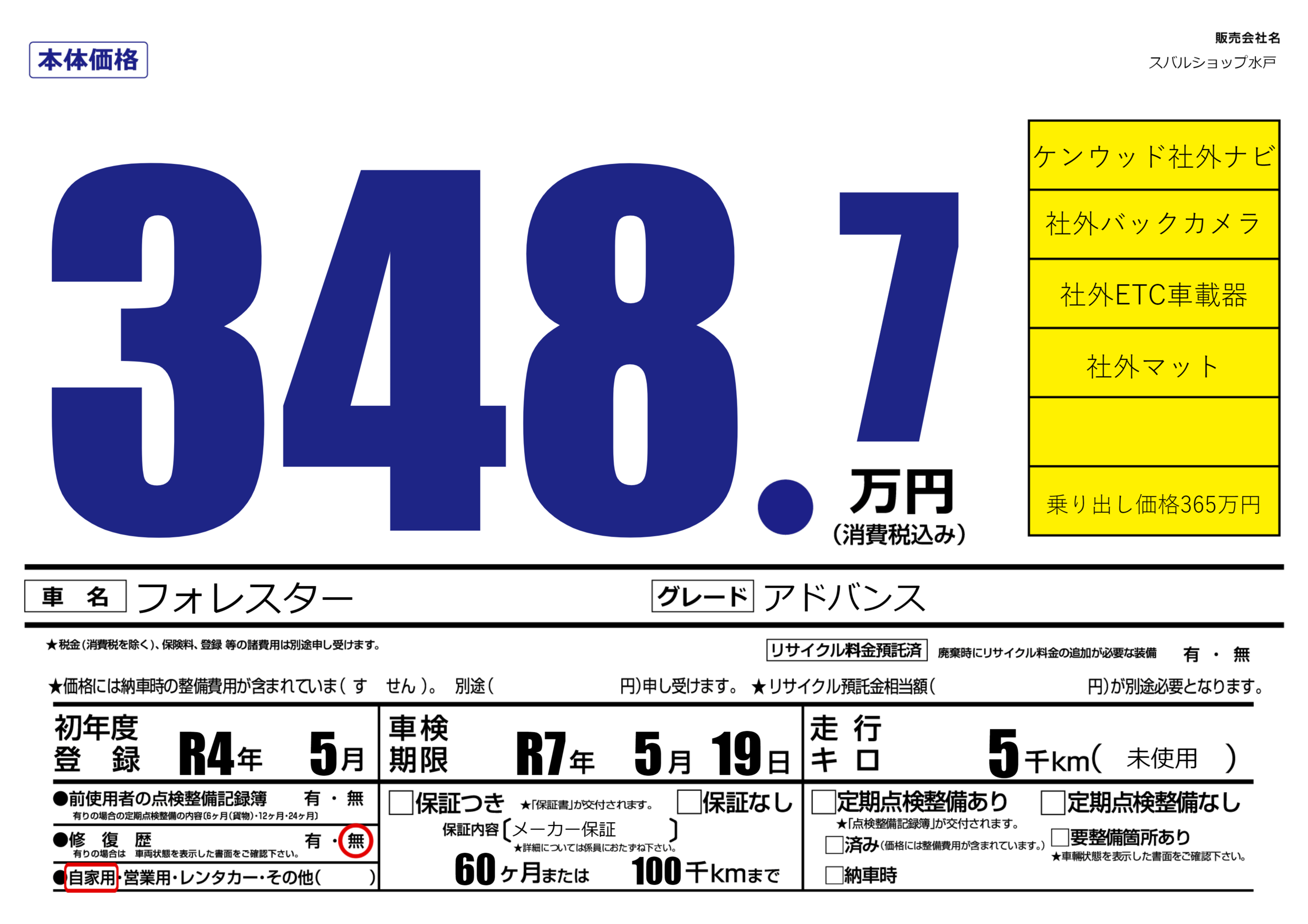 | 車名 | フォレスター | グレード ミッション 排気量 |