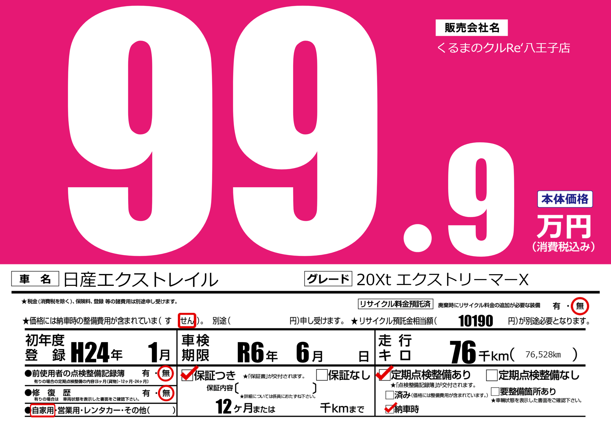 | 定期点検整備 | 定期点検整備あり 納車時あり | ||