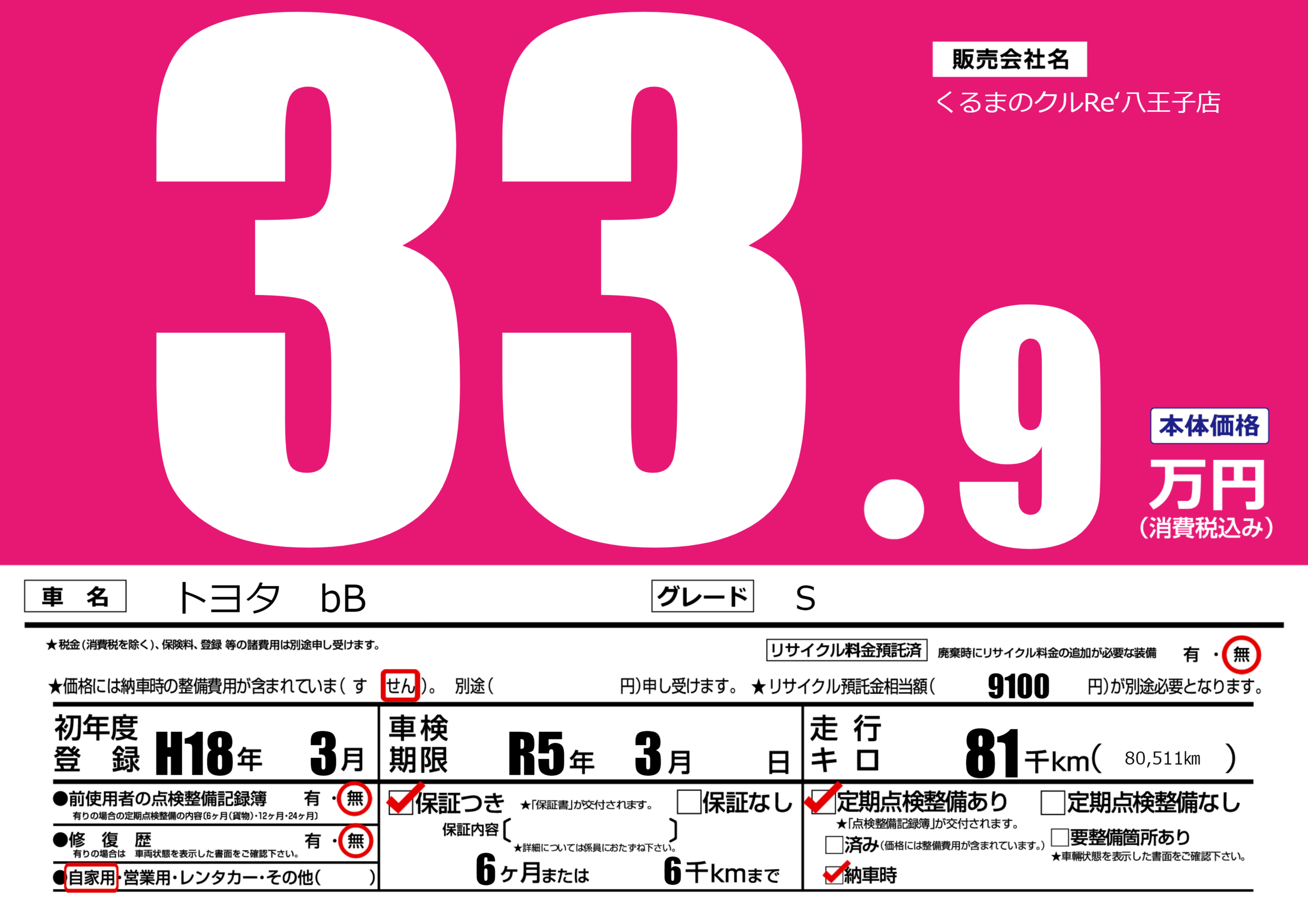 | 車名 | トヨタ bB | グレード ミッション 排気量 |