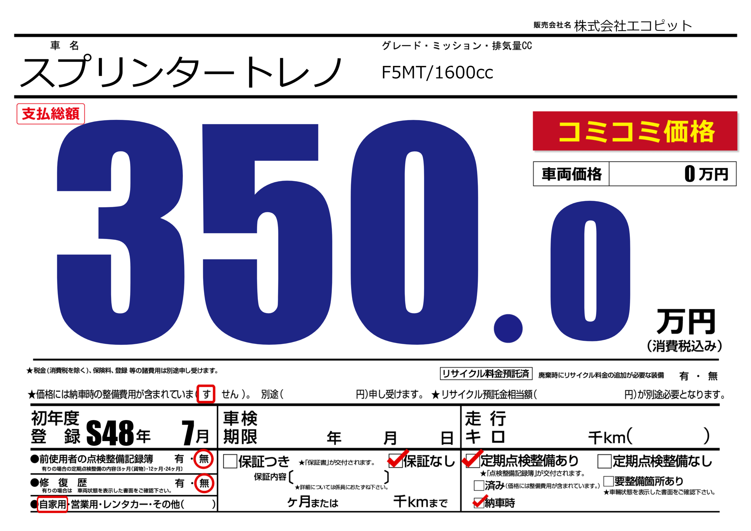 | 車名 | スプリンタートレノ | グレード ミッション 排気量 |