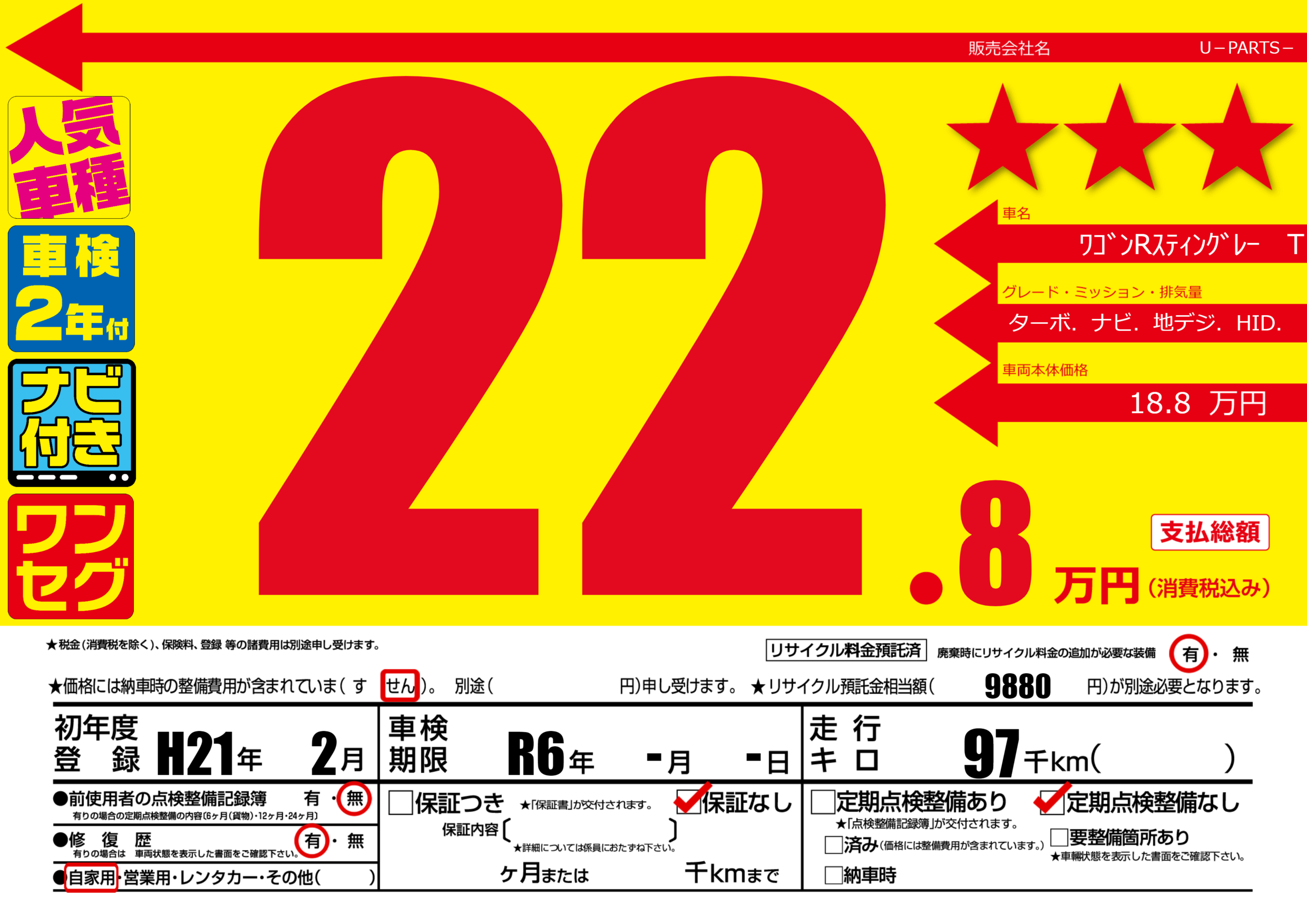 | 走行キロ | 9.7万km | 初年度登録 | H21年2月 |