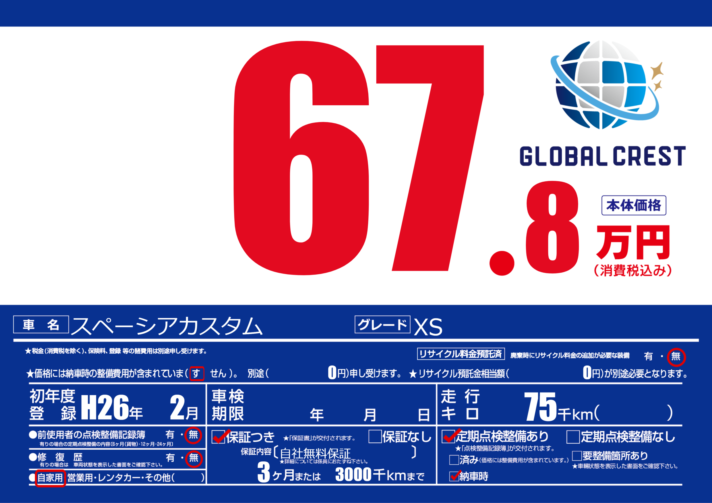| 車名 | スペーシアカスタム | グレード ミッション 排気量 |