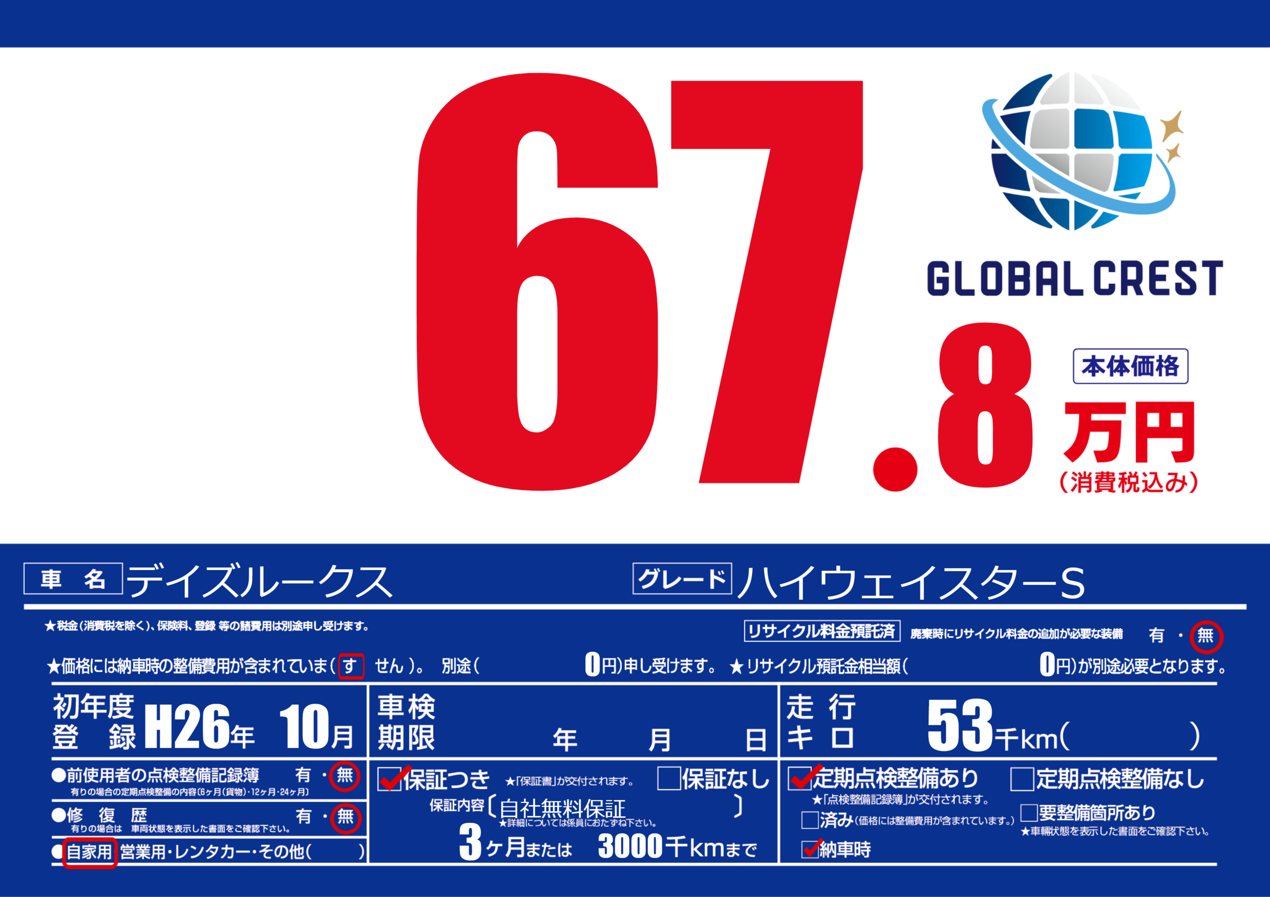 | 走行キロ | 5.3万km | 初年度登録 | H26年10月 |