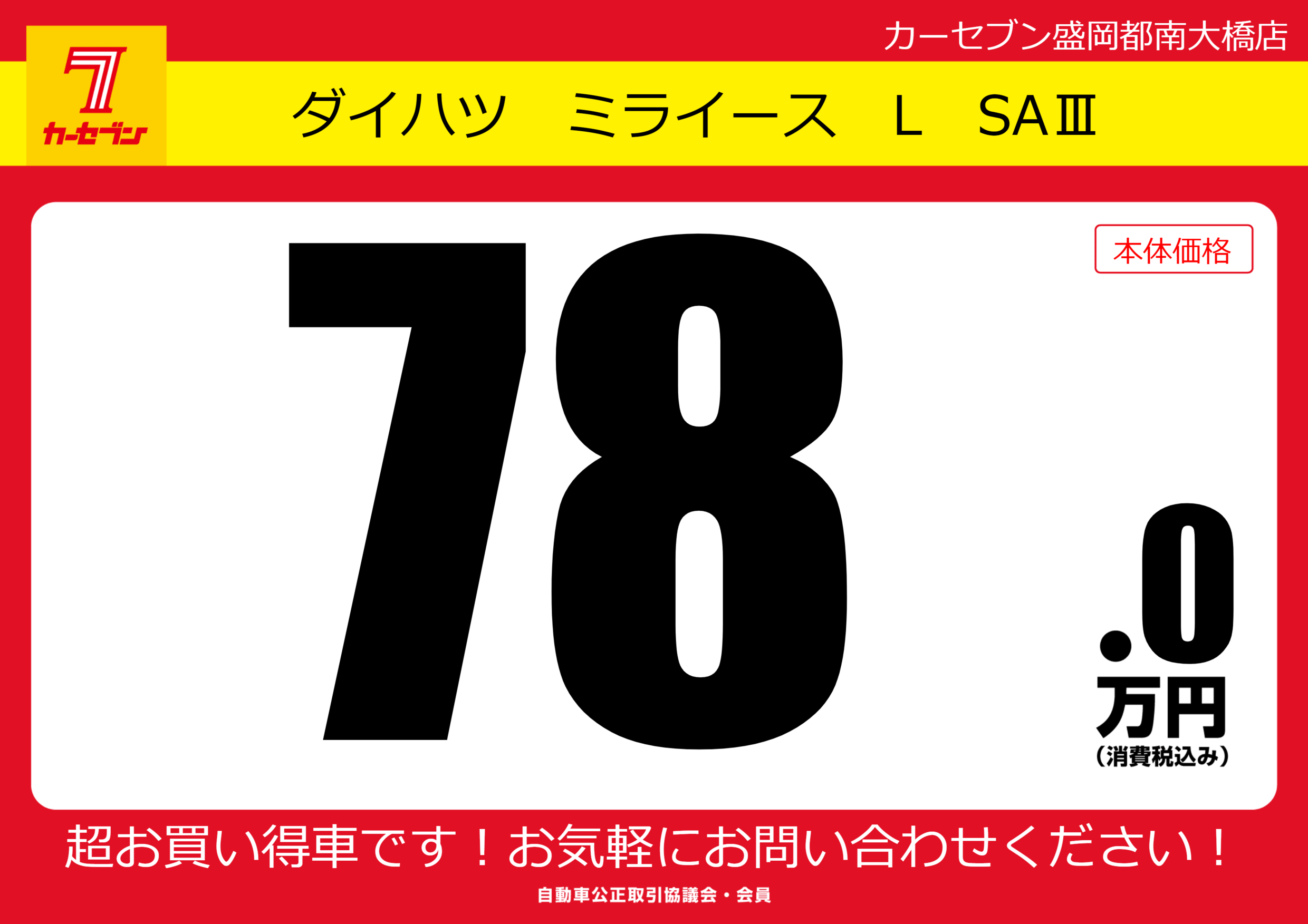 | 車名 | ダイハツ ミライース L SAⅢ | グレード ミッション 排気量 |
