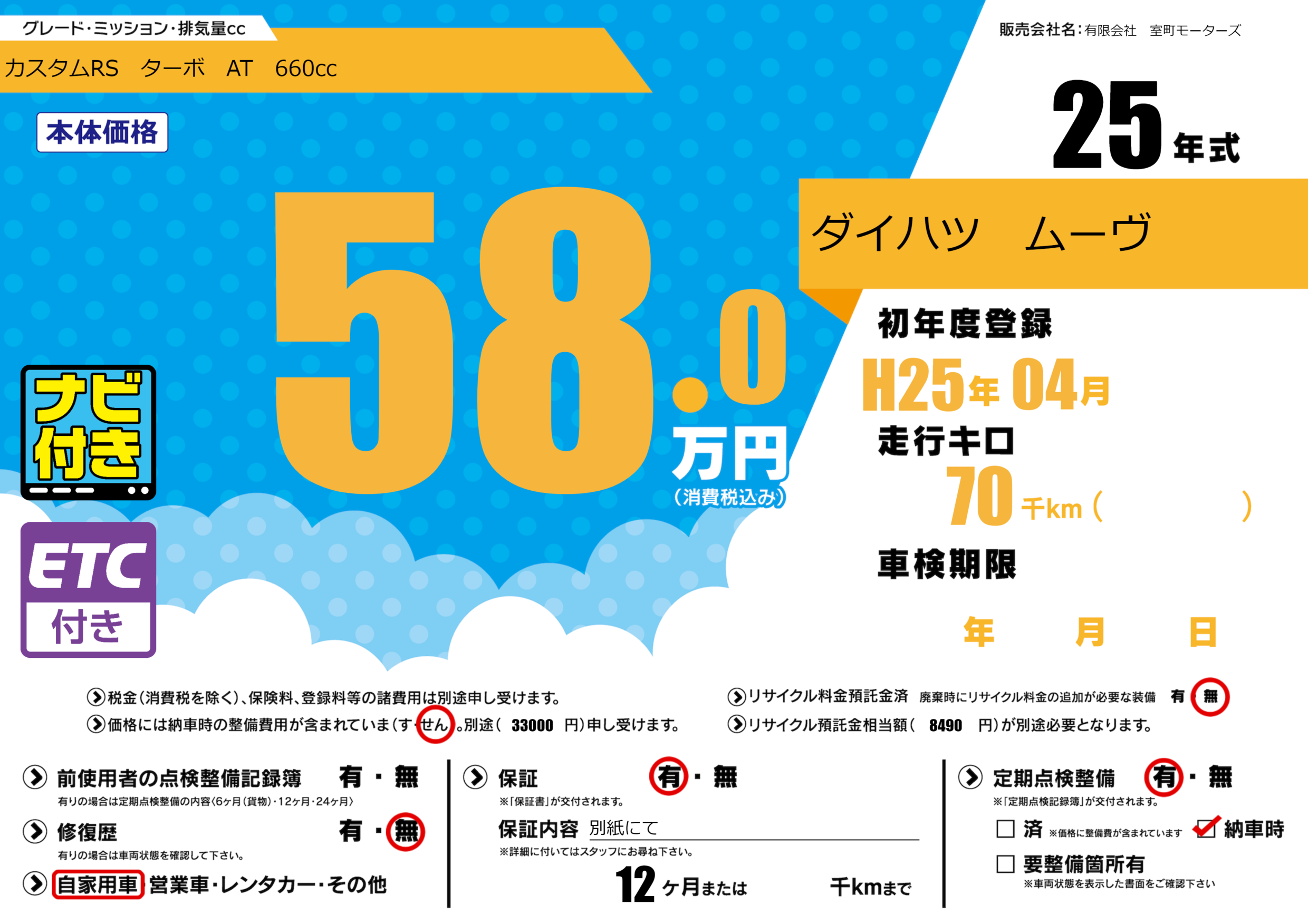 保証付き 保証内容(別紙にて) 12ヶ月または()千kmまで |