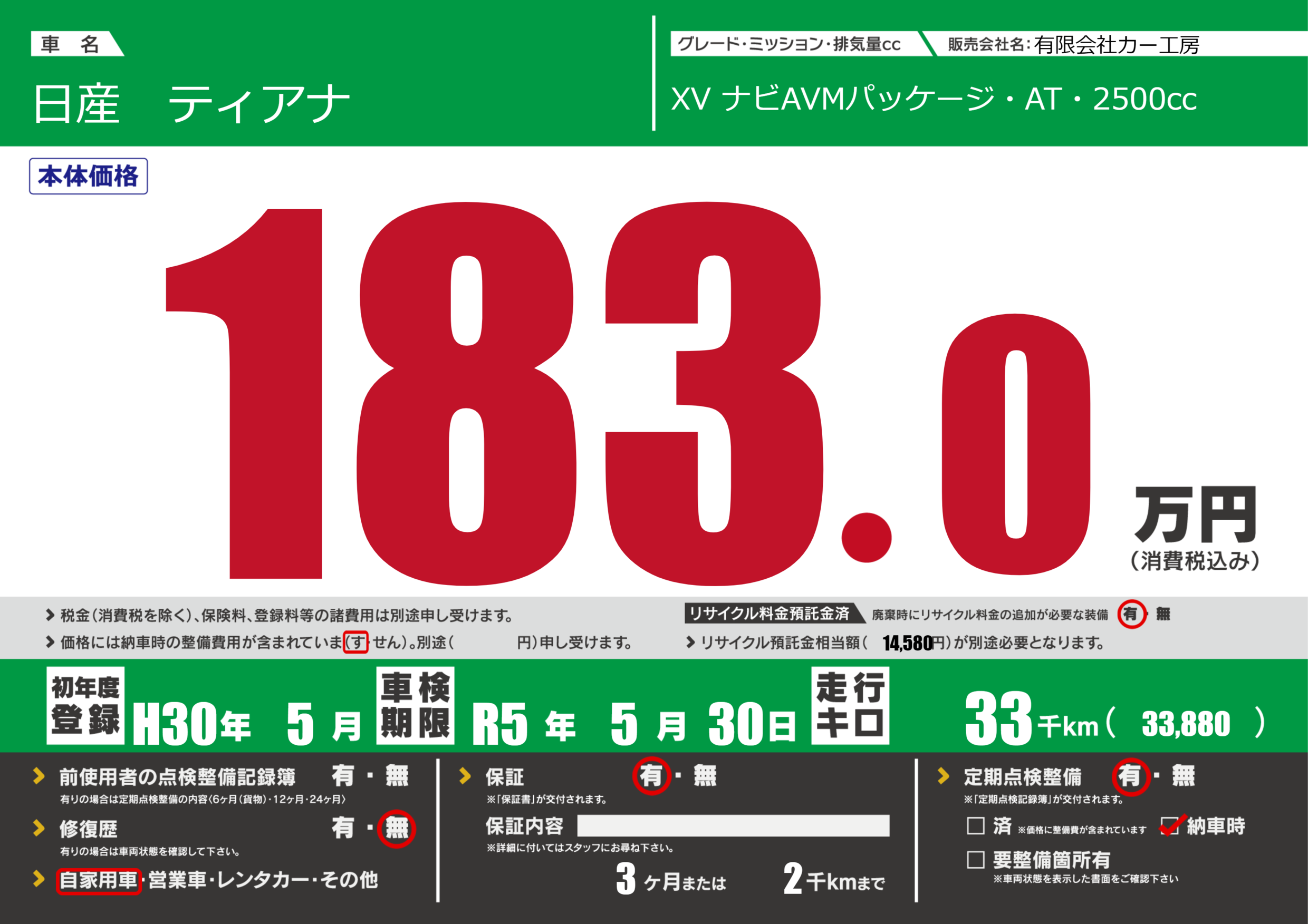 | 車名 | 日産 ティアナ | グレード ミッション 排気量 |