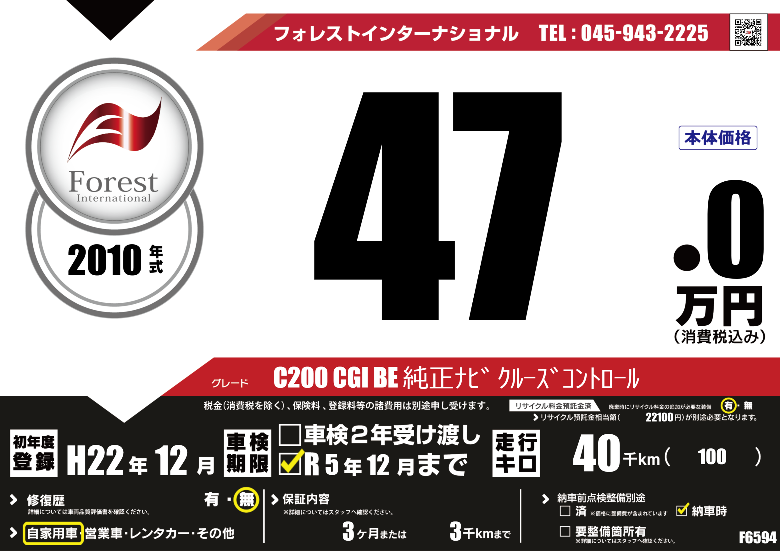 | 走行キロ | 4万km | 初年度登録 | H22年12月 |