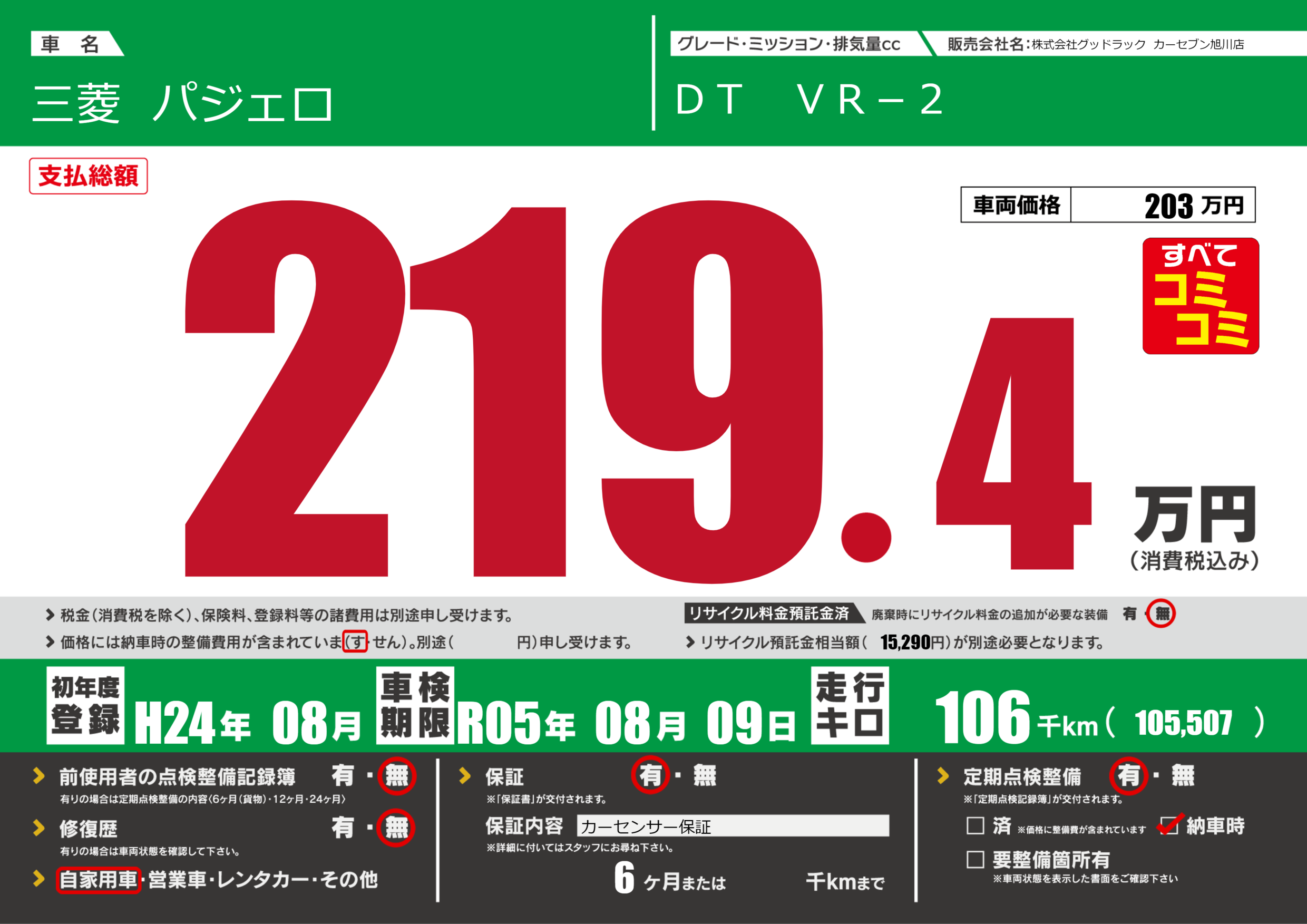 | 走行キロ | 10.6万km | 初年度登録 | H24年08月 |