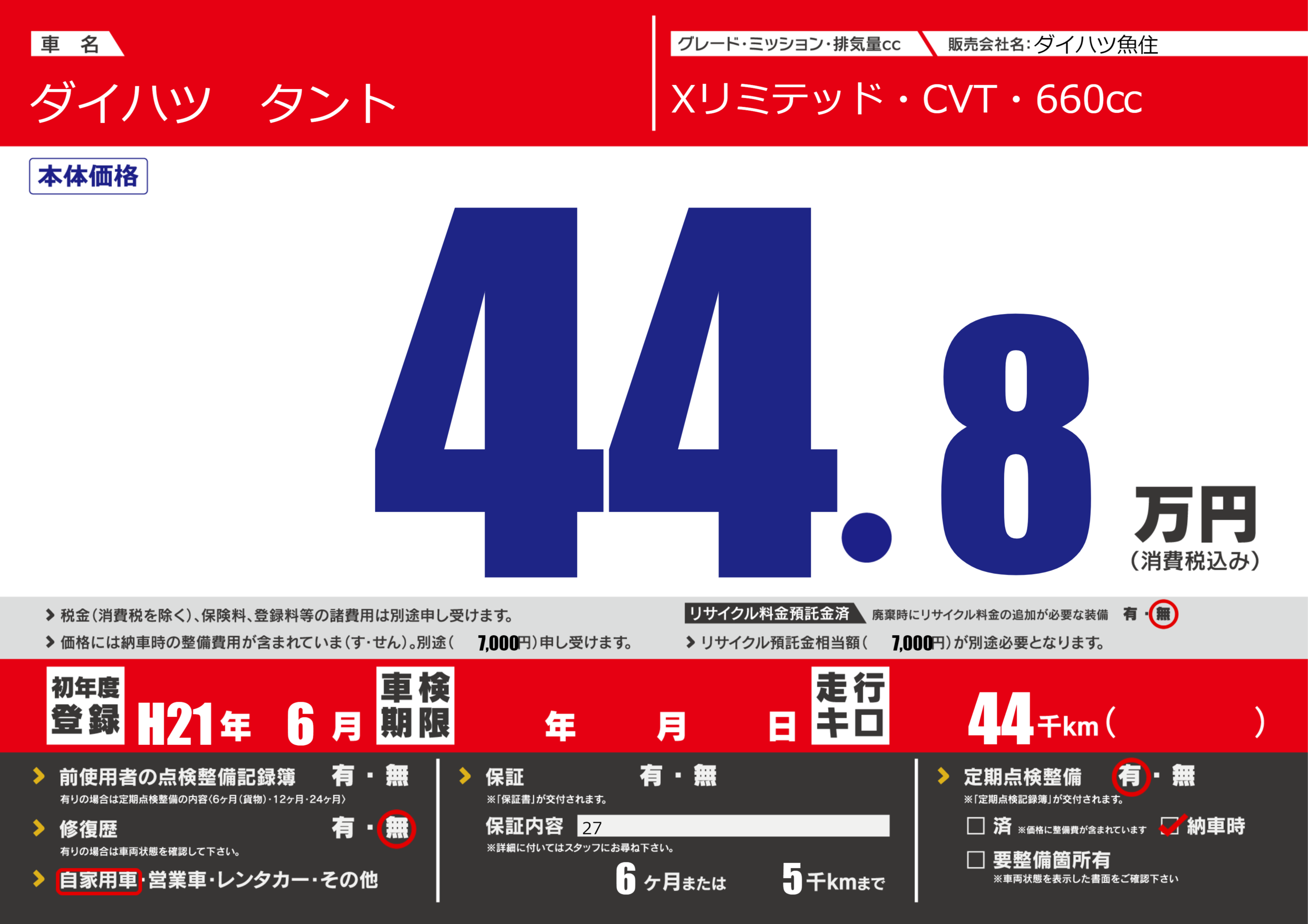 保証なし 保証内容(27) 6ヶ月または(5)千kmまで |