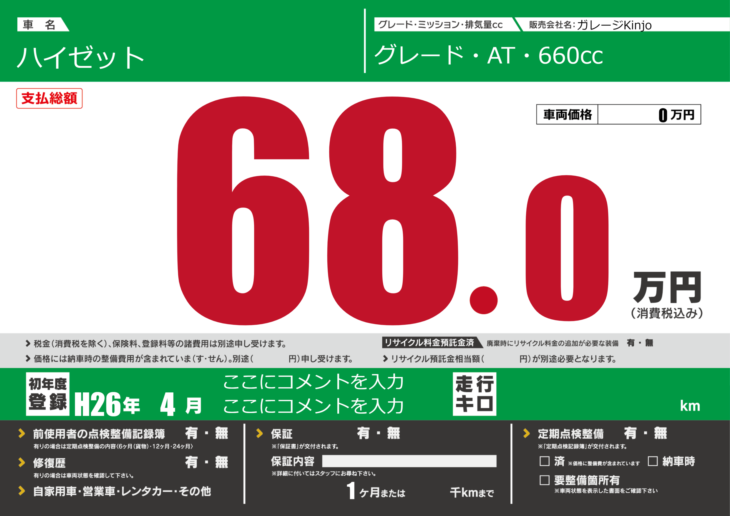 保証なし 保証内容(---) 1ヶ月または()千kmまで |