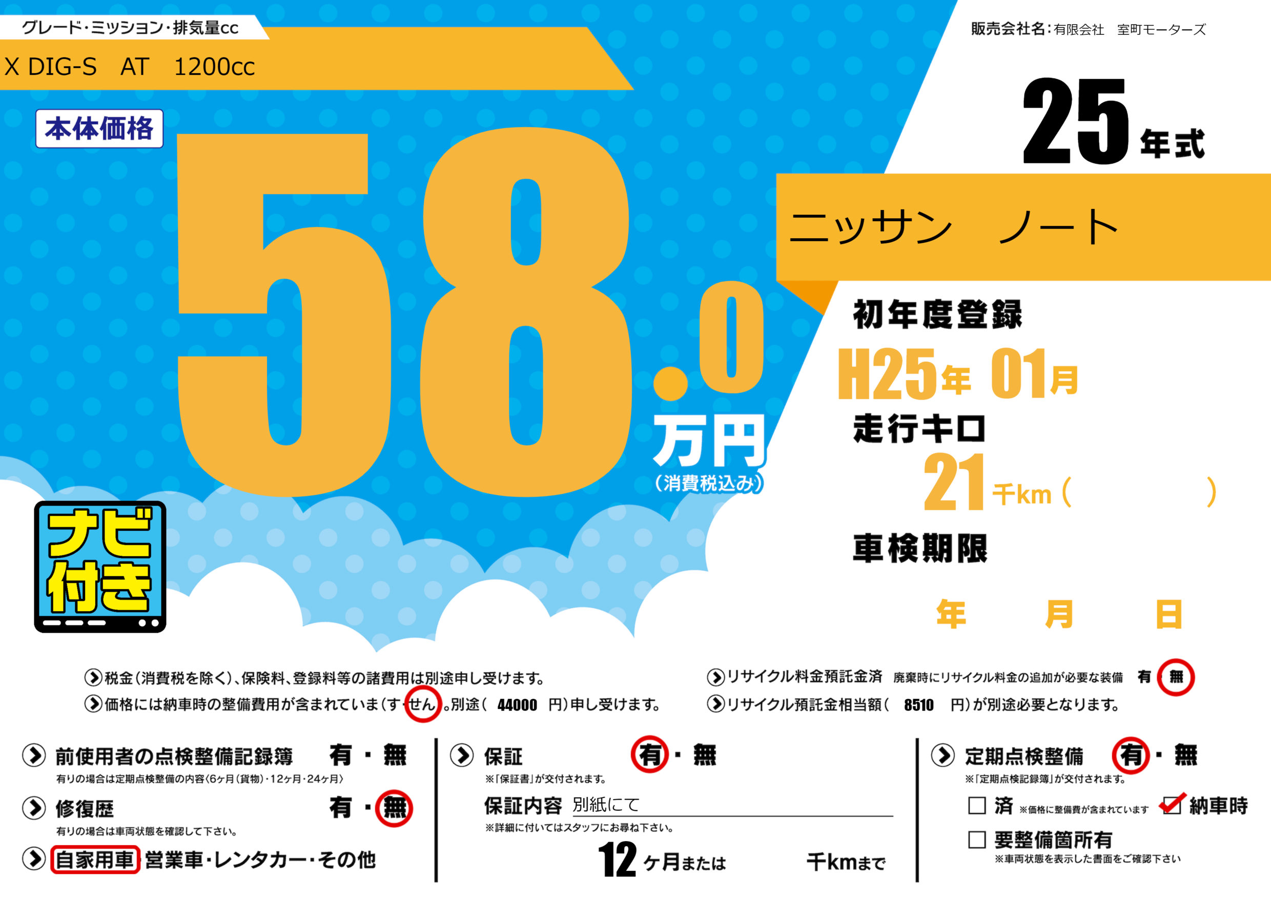 | 車名 | ニッサン ノート | グレード ミッション 排気量 |