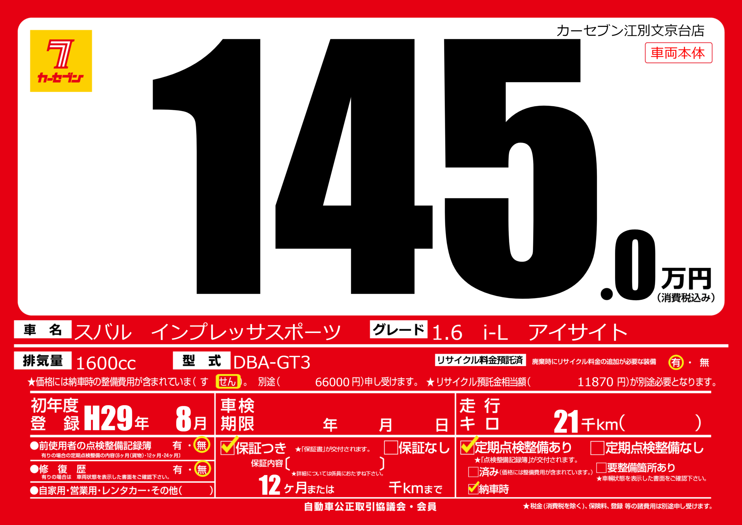 | 車名 | スバル インプレッサスポーツ | グレード ミッション 排気量 |