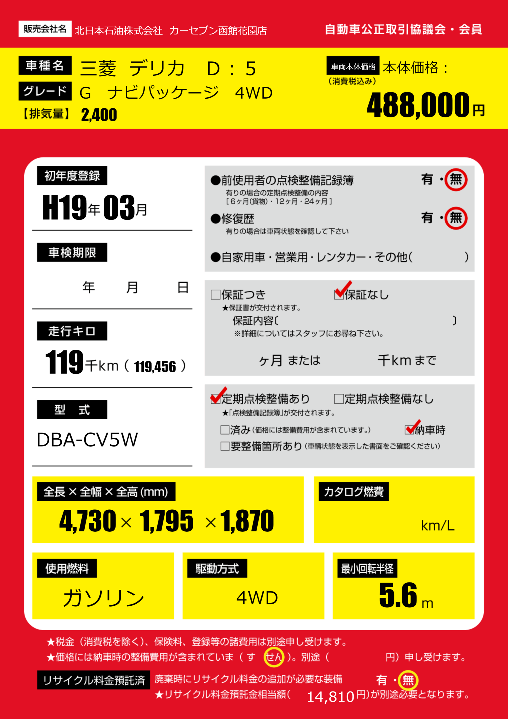| 車名 | 三菱 デリカ D:5 | グレード ミッション 排気量 |