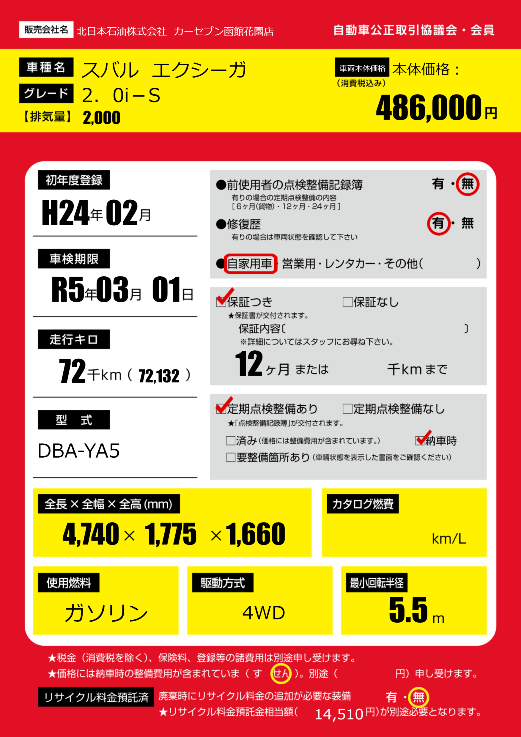 保証付き 保証内容(---) 12ヶ月または()千kmまで |