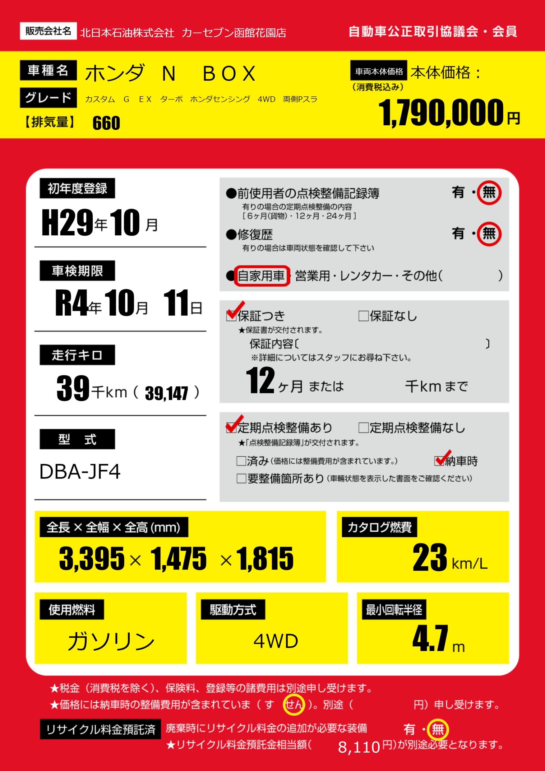 | 車名 | ホンダ N BOX | グレード ミッション 排気量 |