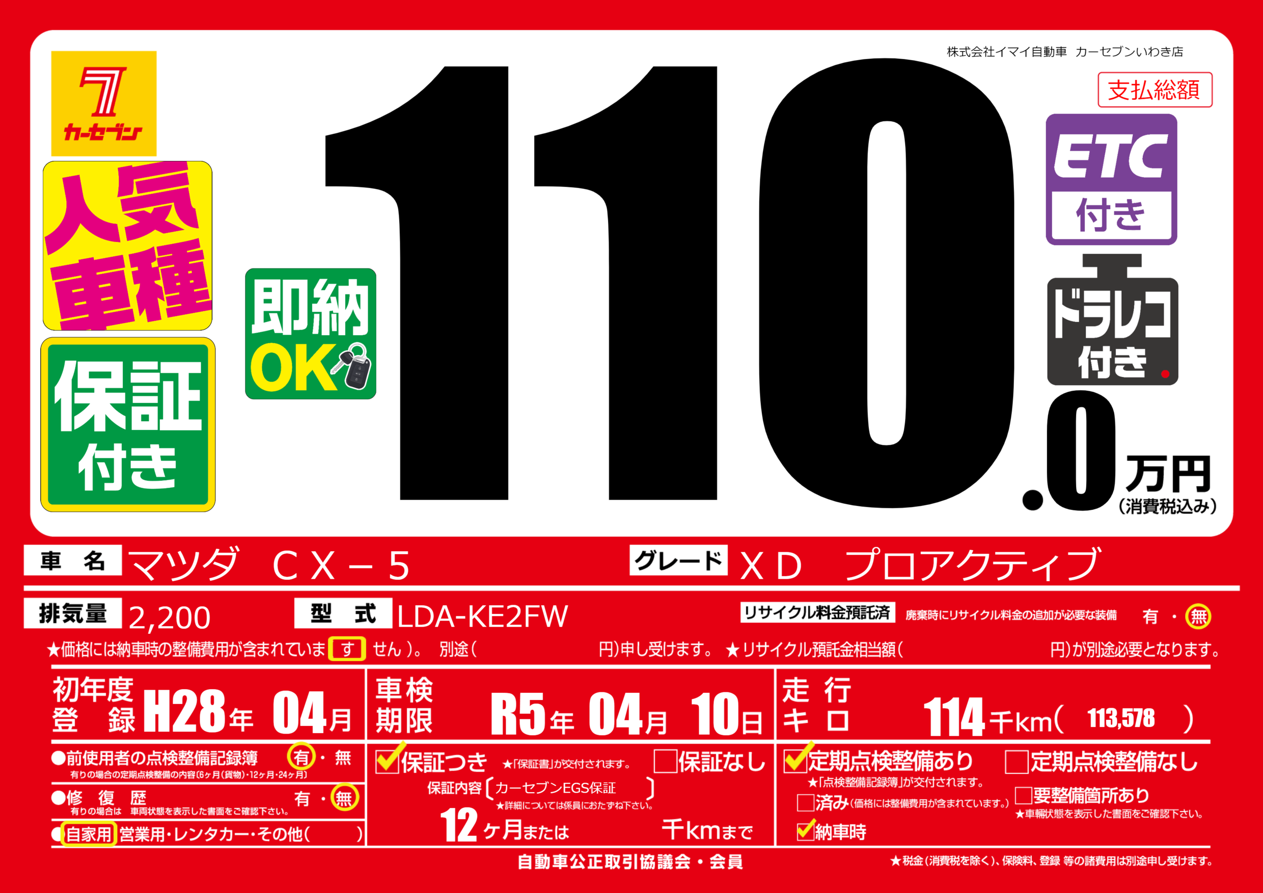 | 定期点検整備 | 定期点検整備あり 納車時あり | ||