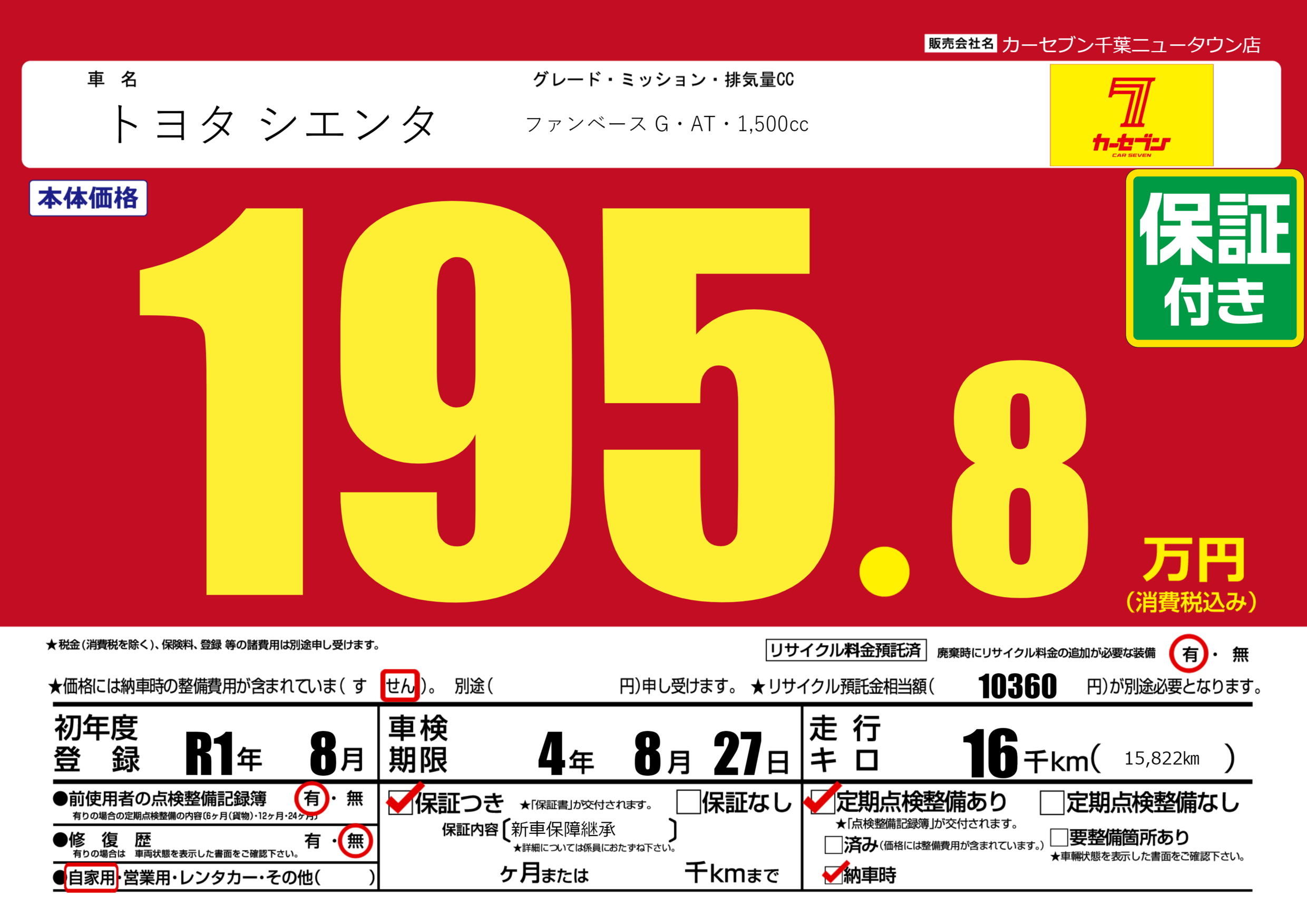| 車名 | トヨタ シエンタ | グレード ミッション 排気量 |