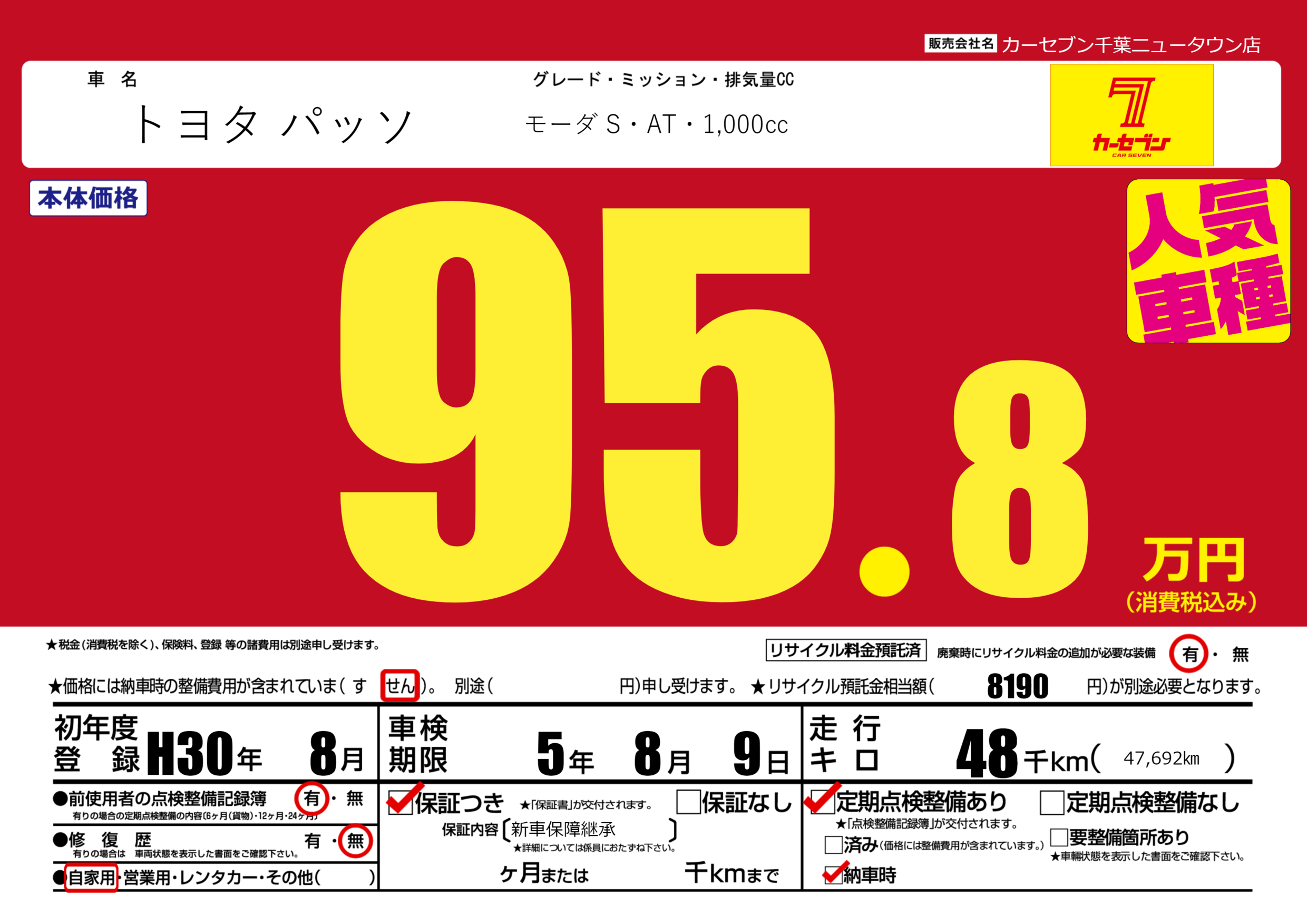 | 車名 | トヨタ パッソ | グレード ミッション 排気量 |