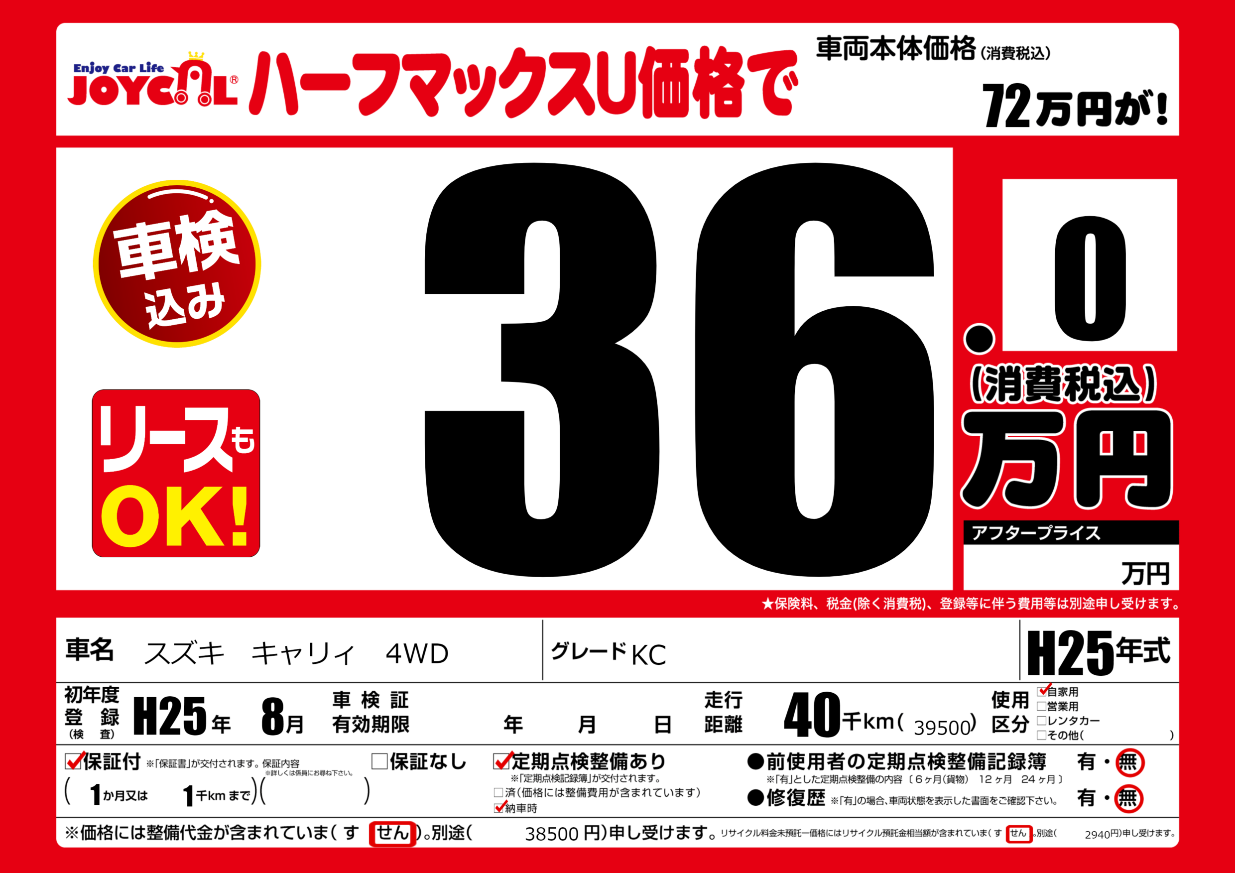 | 走行キロ | 4万km | 初年度登録 | H25年8月 |