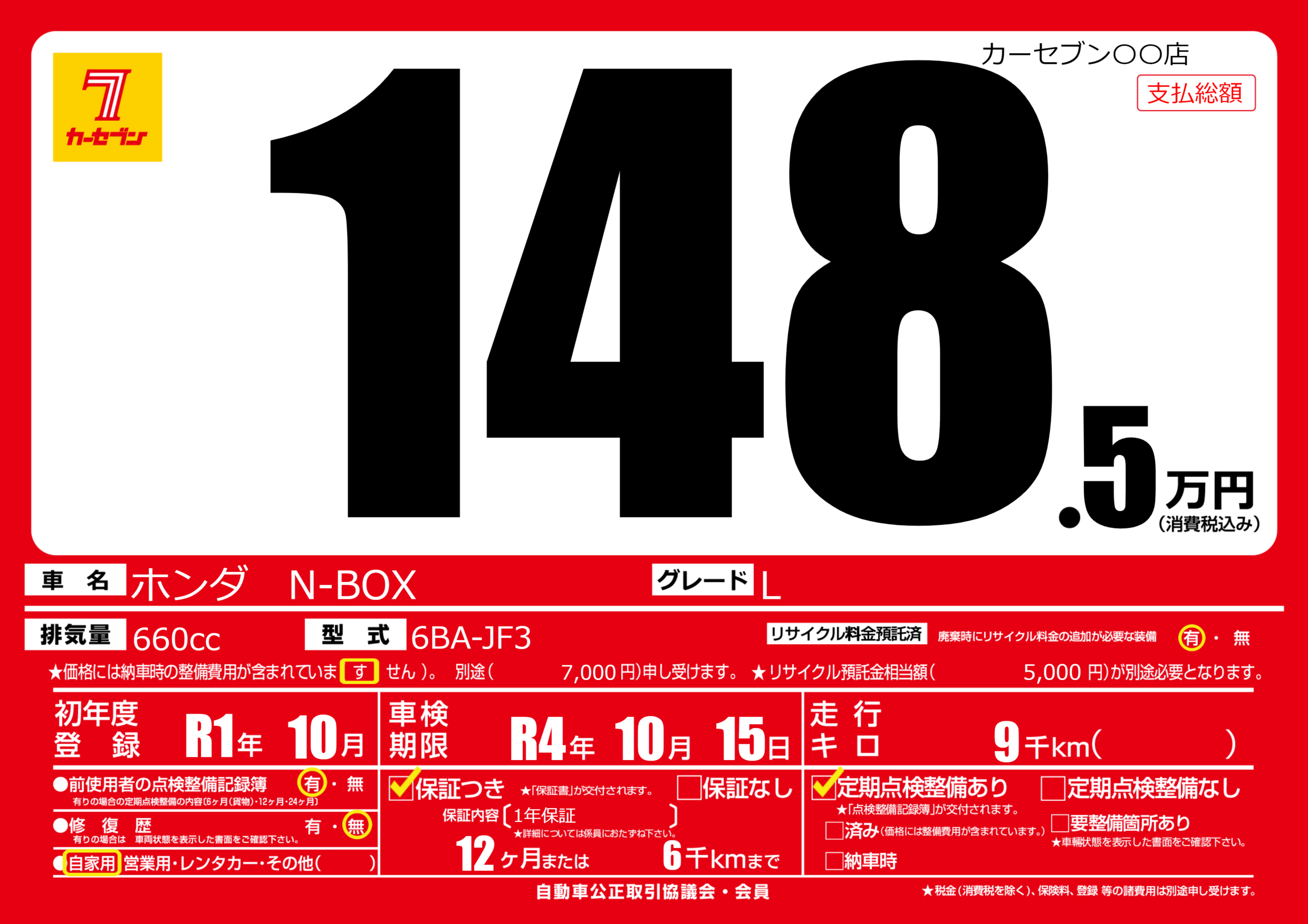 保証付き 保証内容(1年保証) 12ヶ月または(6)千kmまで |