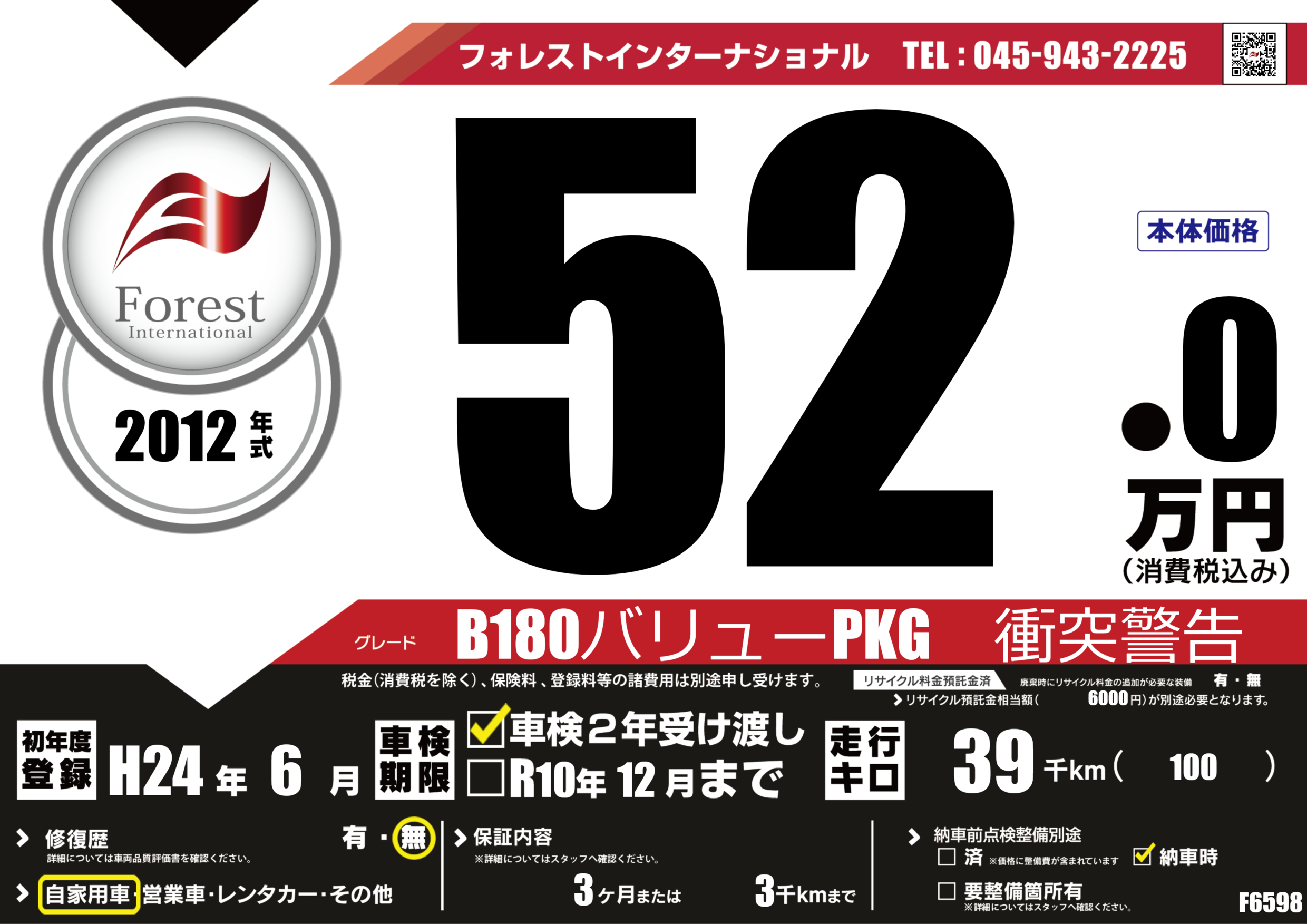 | 走行キロ | 3.9万km | 初年度登録 | H24年6月 |