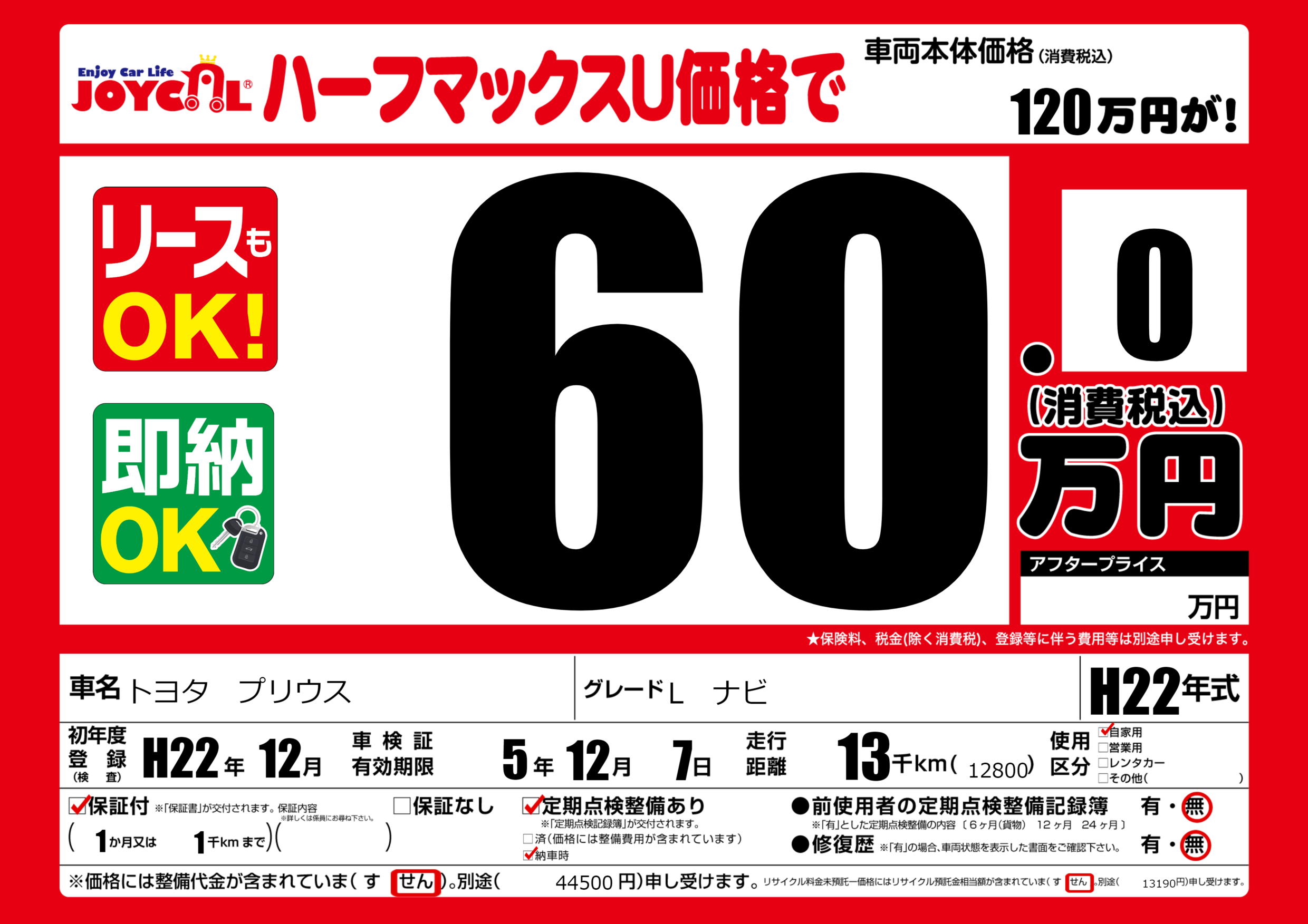 | 走行キロ | 1.3万km | 初年度登録 | H22年12月 |