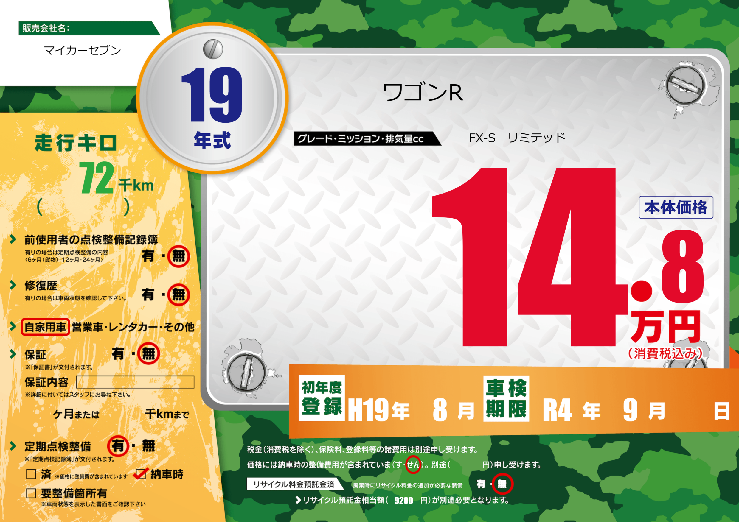 | 車名 | ワゴンR | グレード ミッション 排気量 |