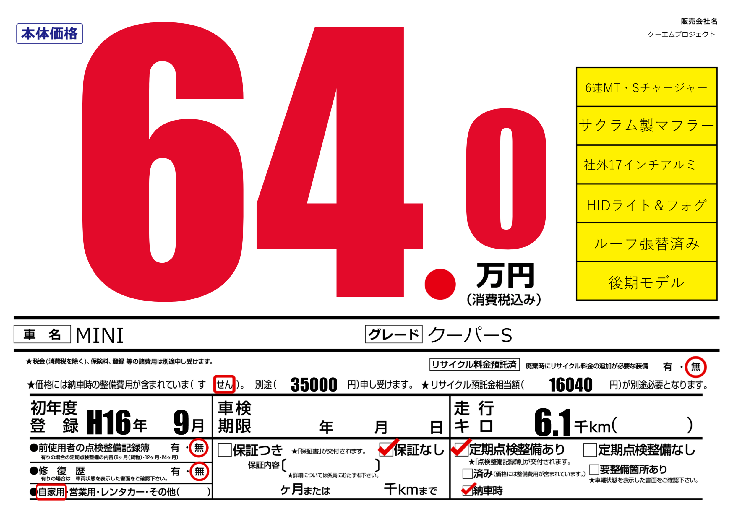 | 走行キロ | 0.6万km | 初年度登録 | H16年9月 |