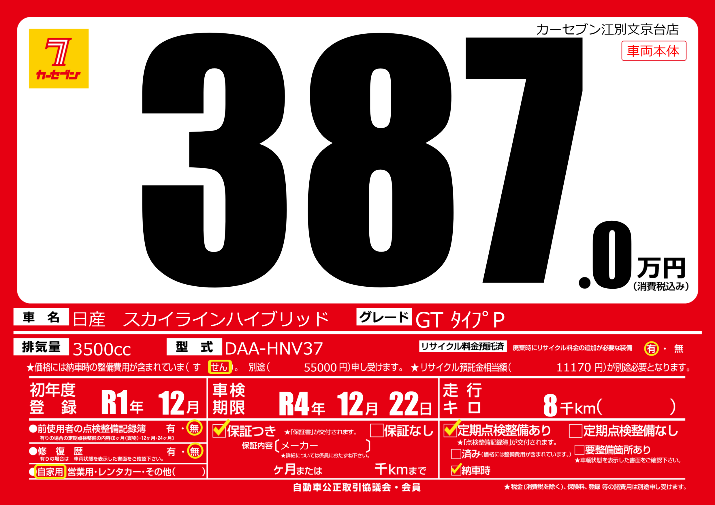 | 車名 | 日産 スカイラインハイブリッド | グレード ミッション 排気量 |