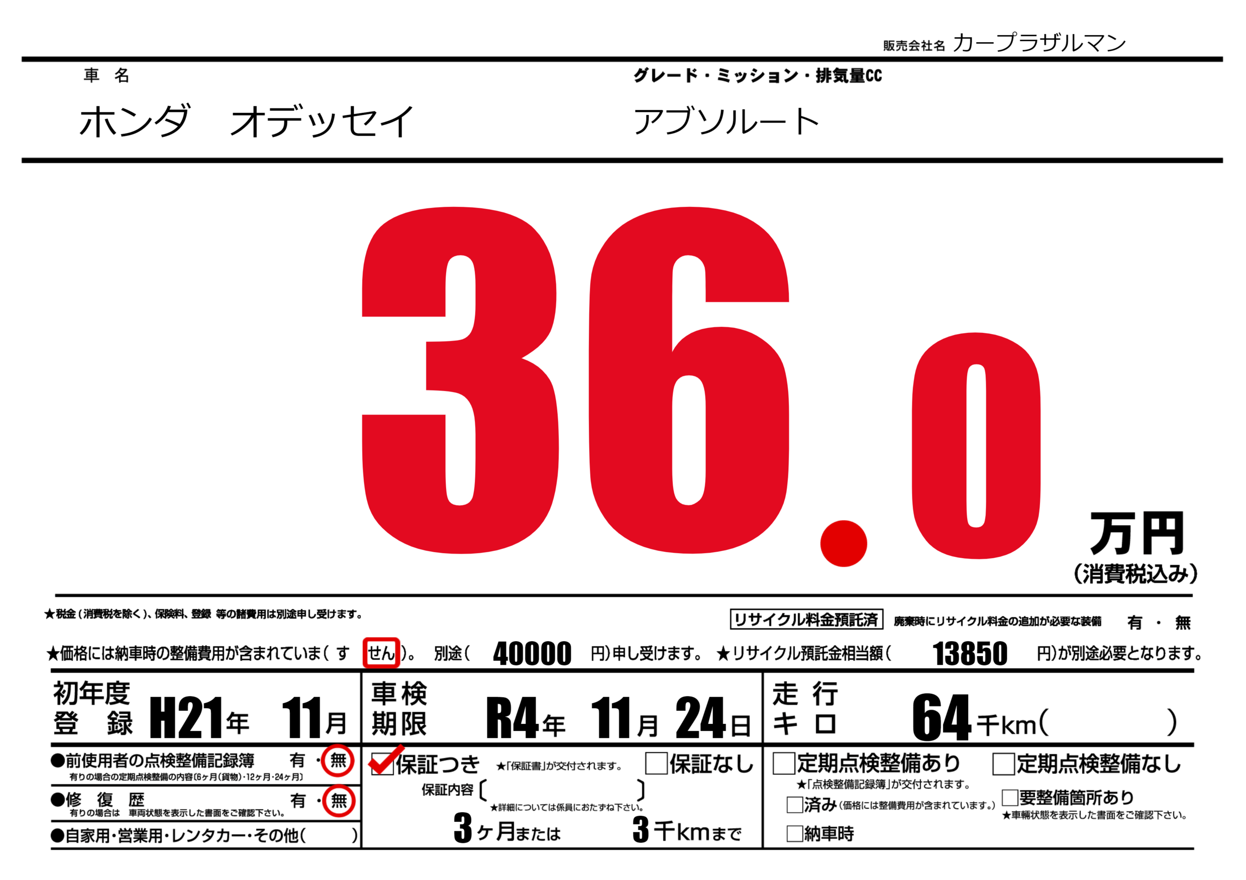 保証付き 保証内容(---) 3ヶ月または(3)千kmまで |