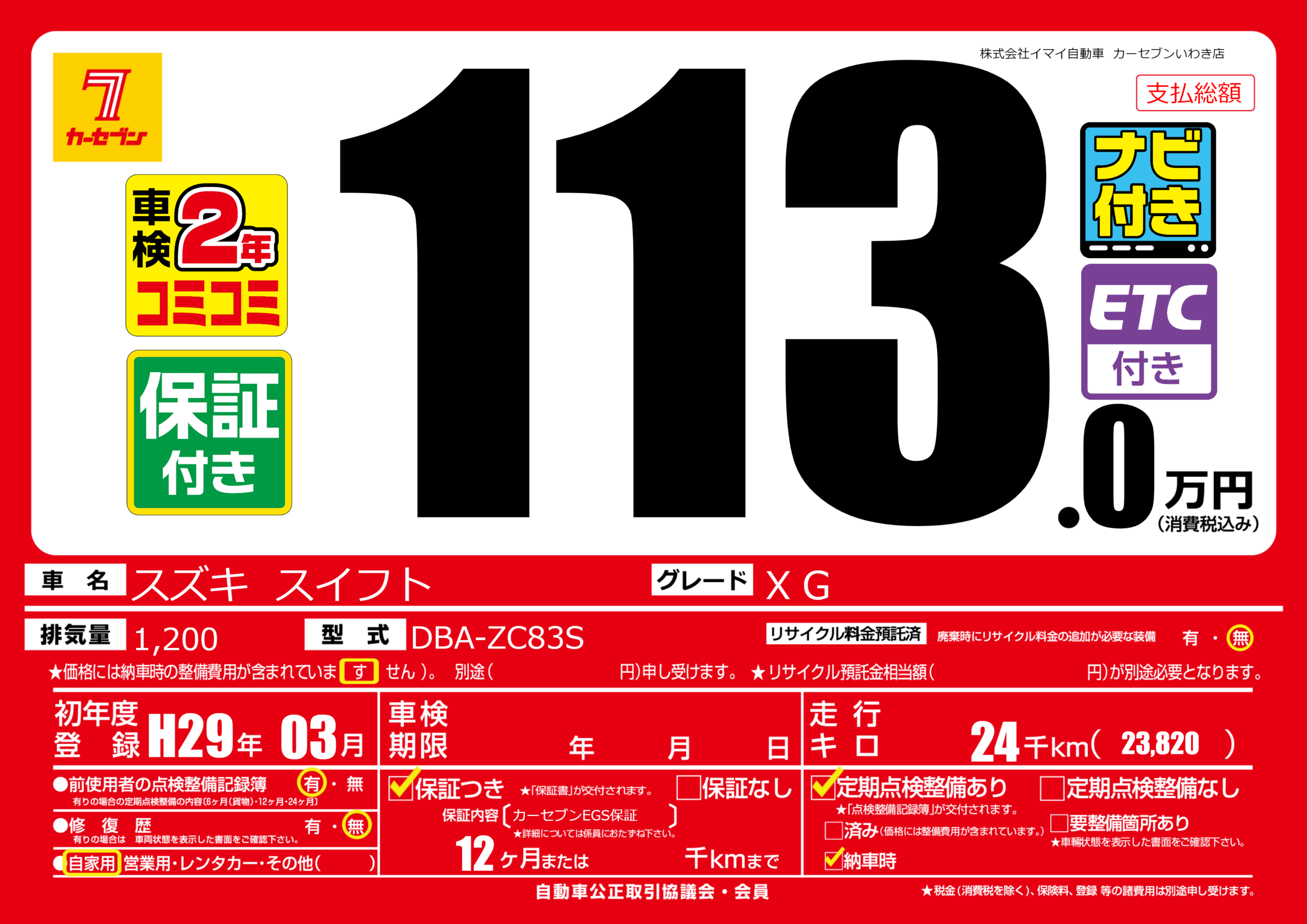 | 走行キロ | 2.4万km | 初年度登録 | H29年03月 |