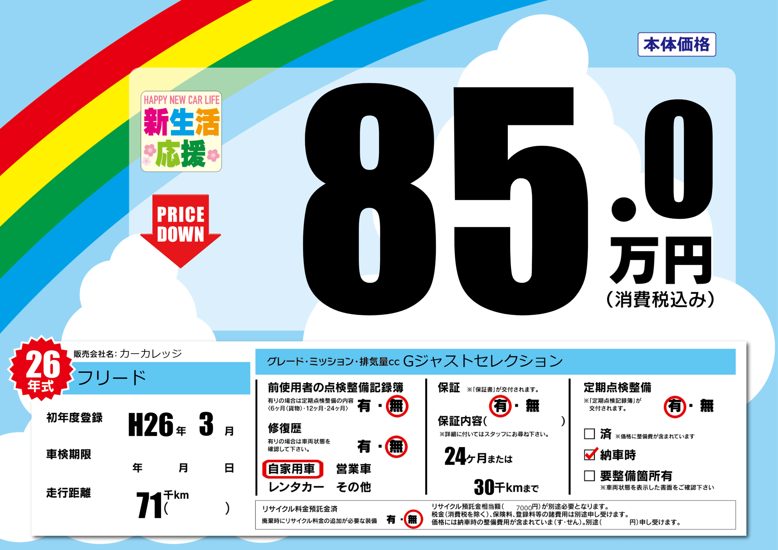 保証付き 保証内容(---) 24ヶ月または(30)千kmまで |