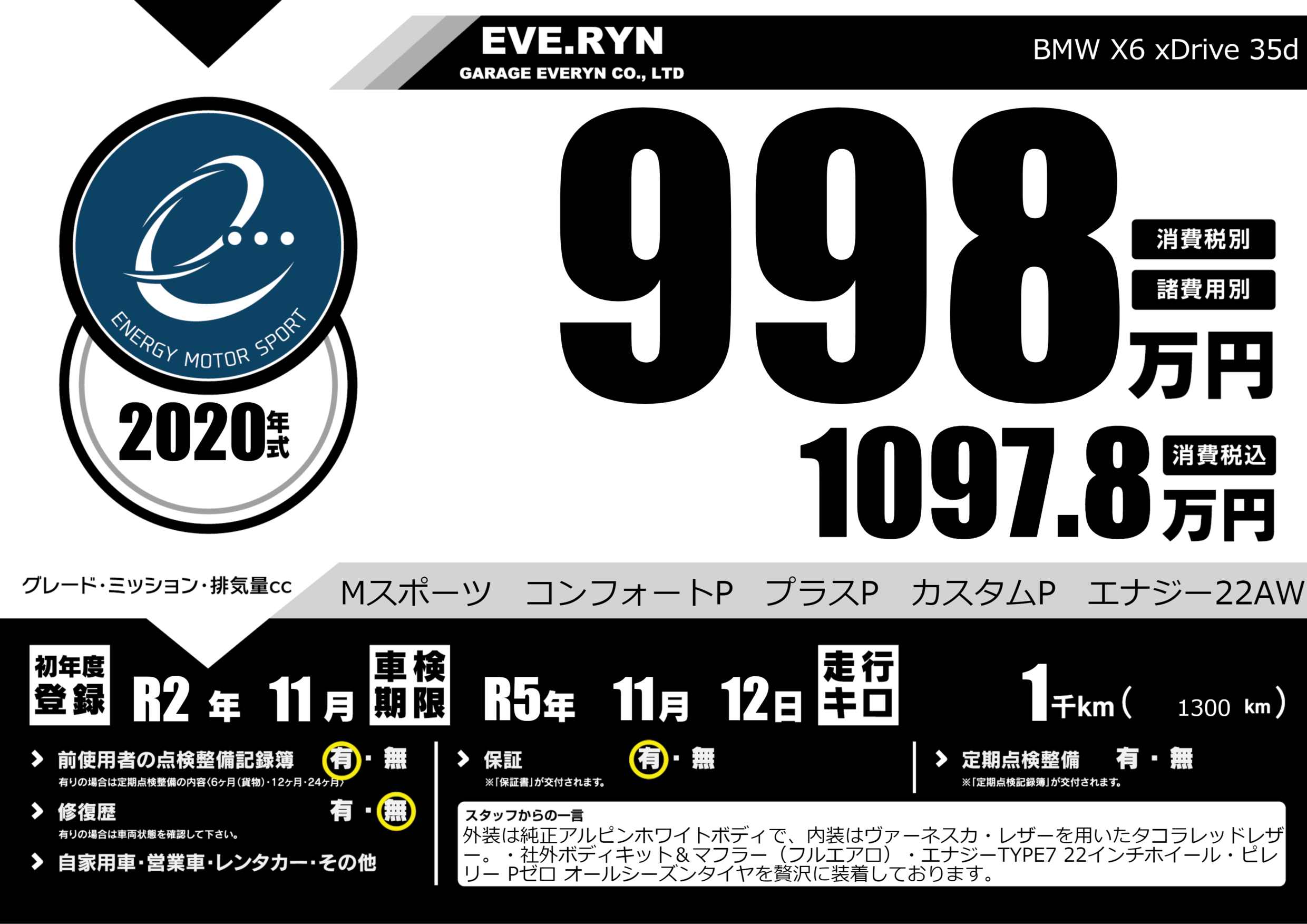 | 車名 | BMW X6 xDrive 35d | グレード ミッション 排気量 |