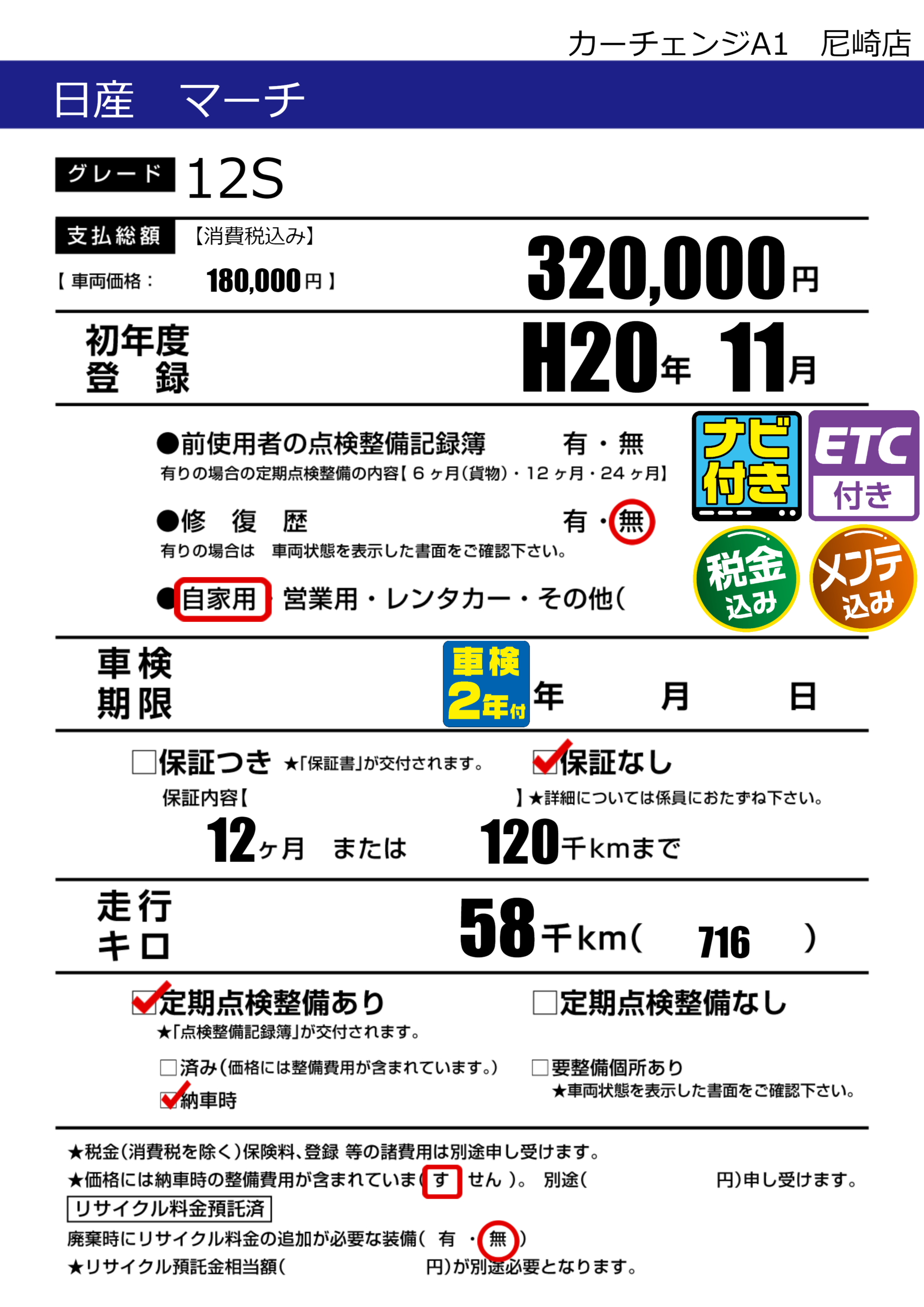 | 車名 | 日産 マーチ | グレード ミッション 排気量 |