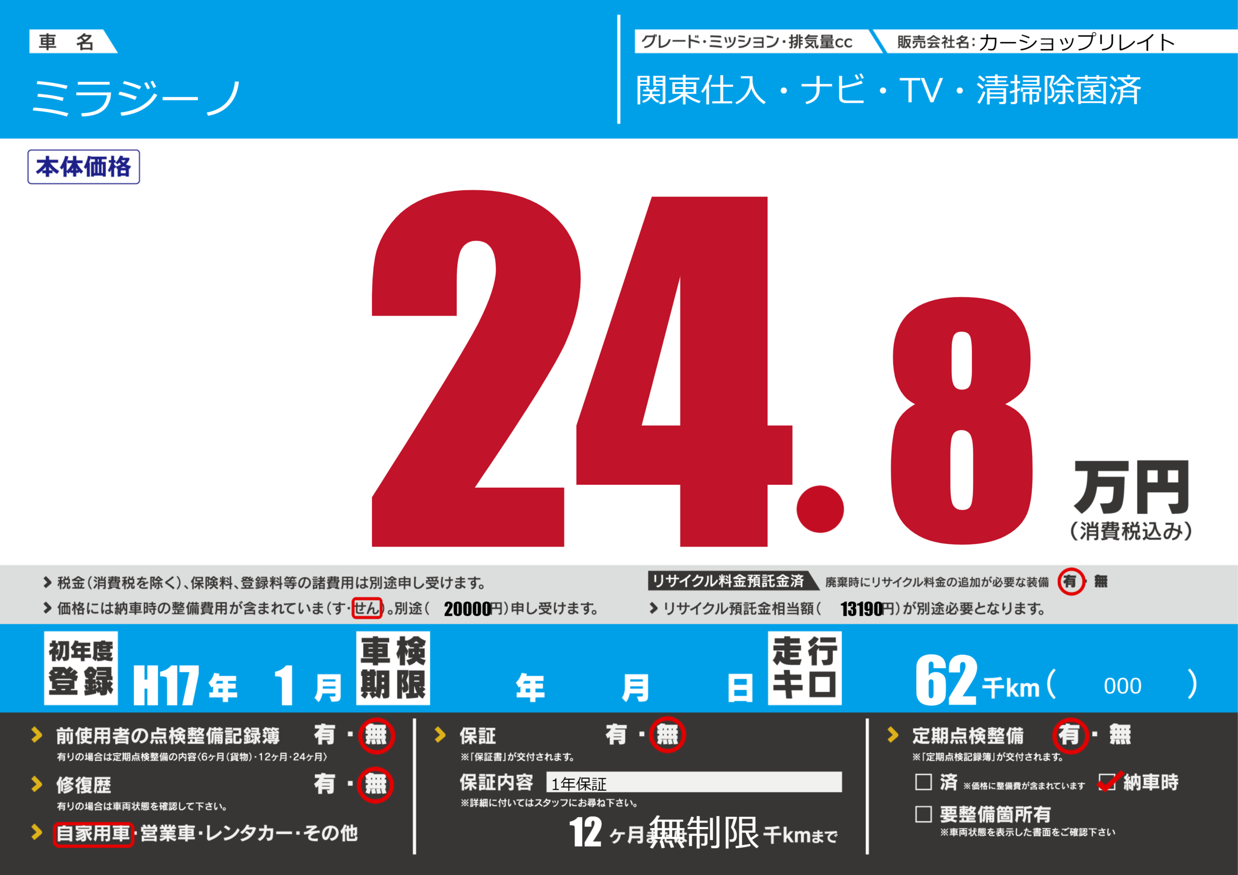 | 定期点検整備 | 定期点検整備あり 納車時あり | ||