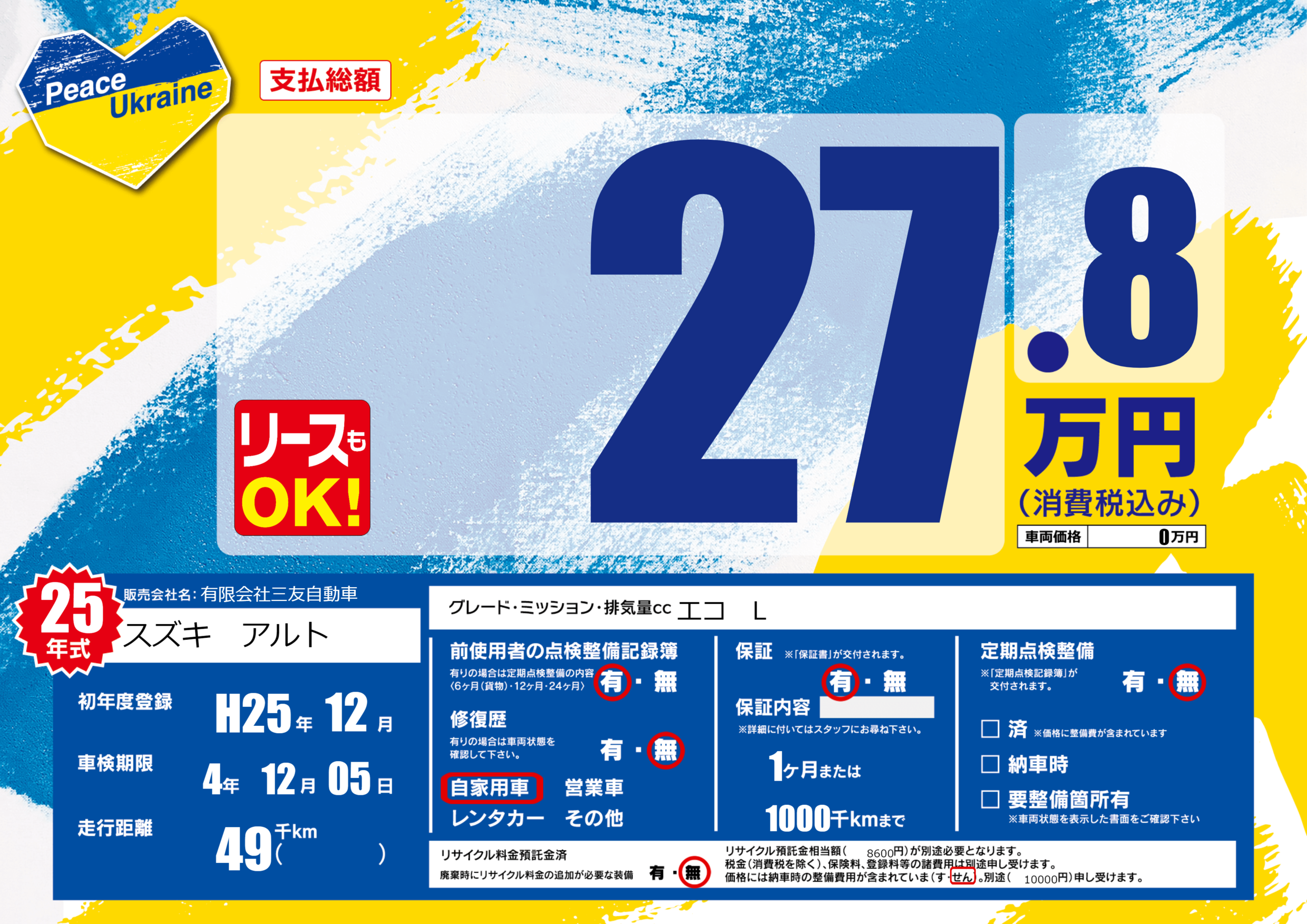 保証付き 保証内容(---) 1ヶ月または(1000)千kmまで |