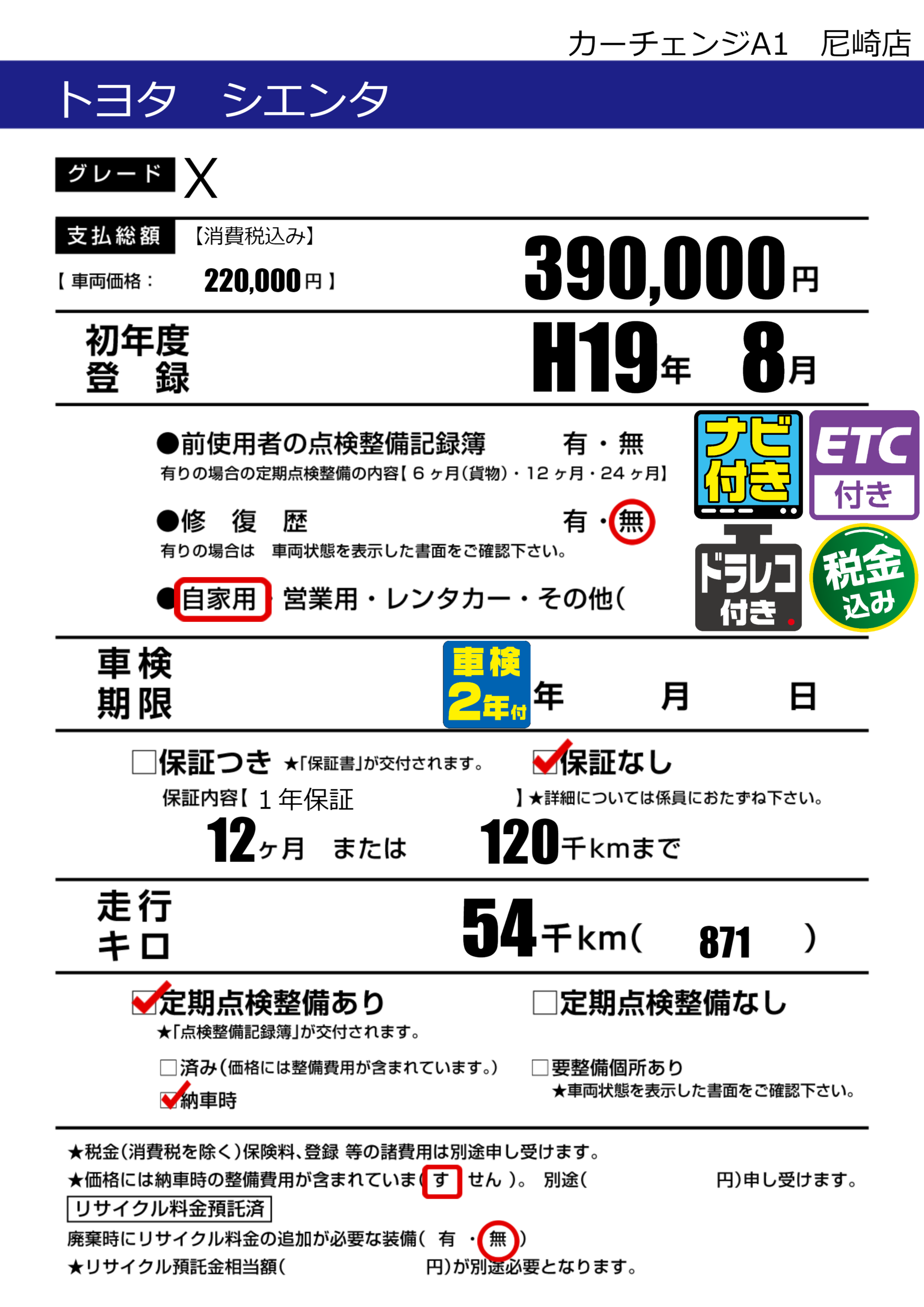 | 車名 | トヨタ シエンタ | グレード ミッション 排気量 |