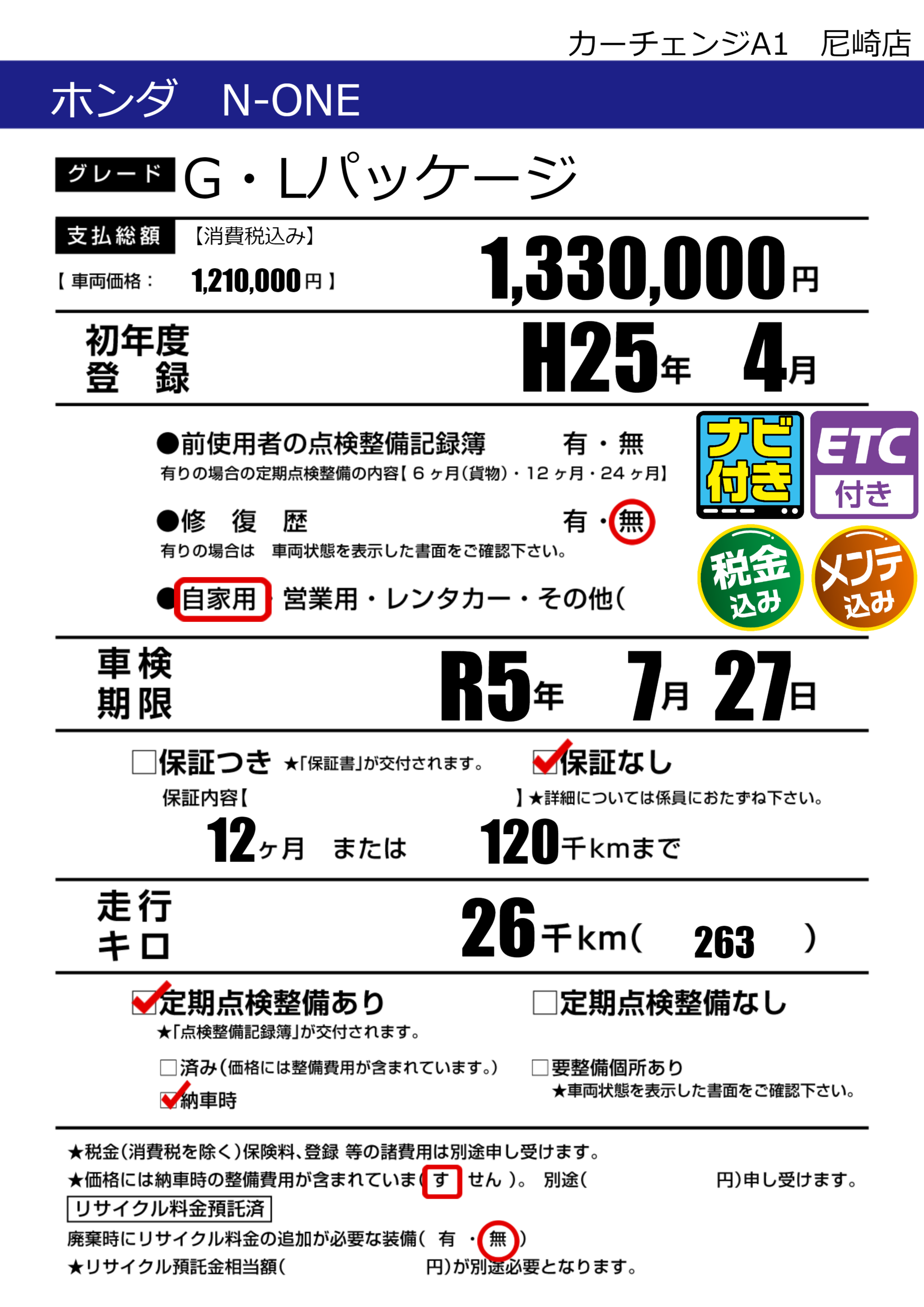 | 車名 | ホンダ N-ONE | グレード ミッション 排気量 |