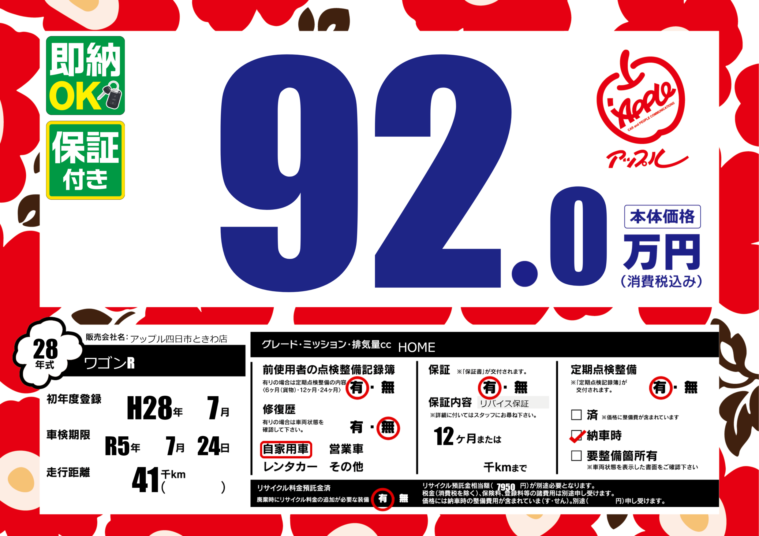| 走行キロ | 4.1万km | 初年度登録 | H28年7月 |