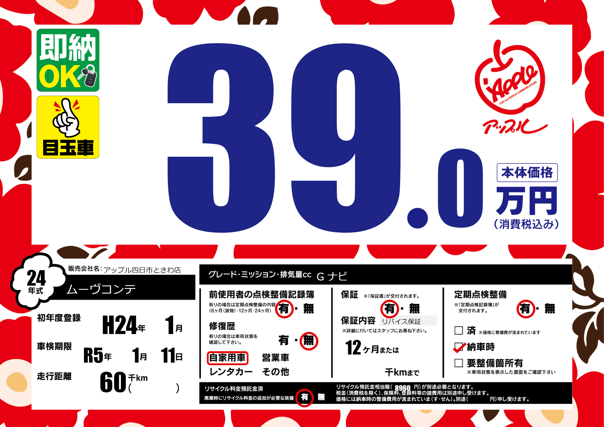 | 定期点検整備 | 定期点検整備あり 納車時あり | ||