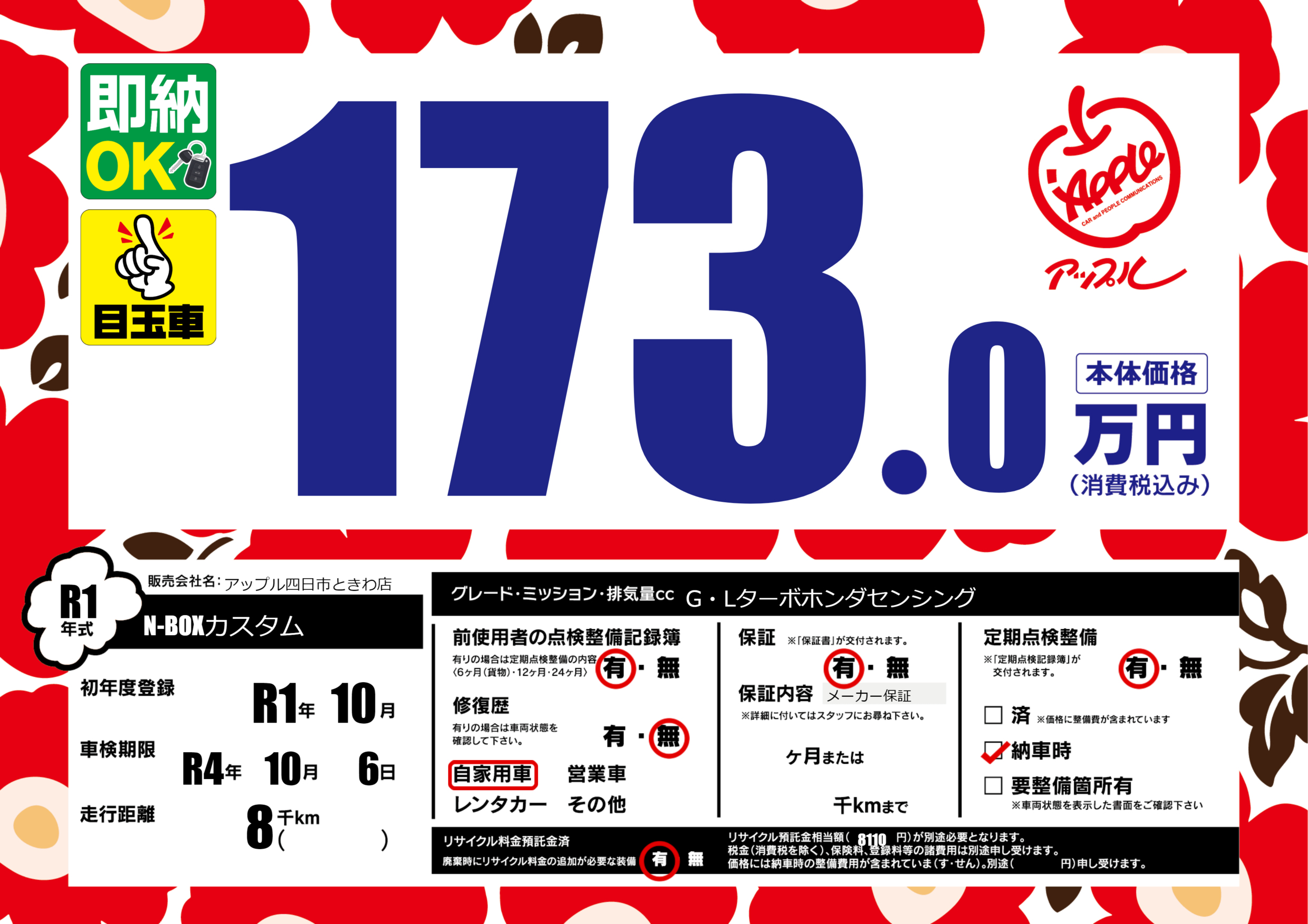 | 走行キロ | 0.8万km | 初年度登録 | R1年10月 |