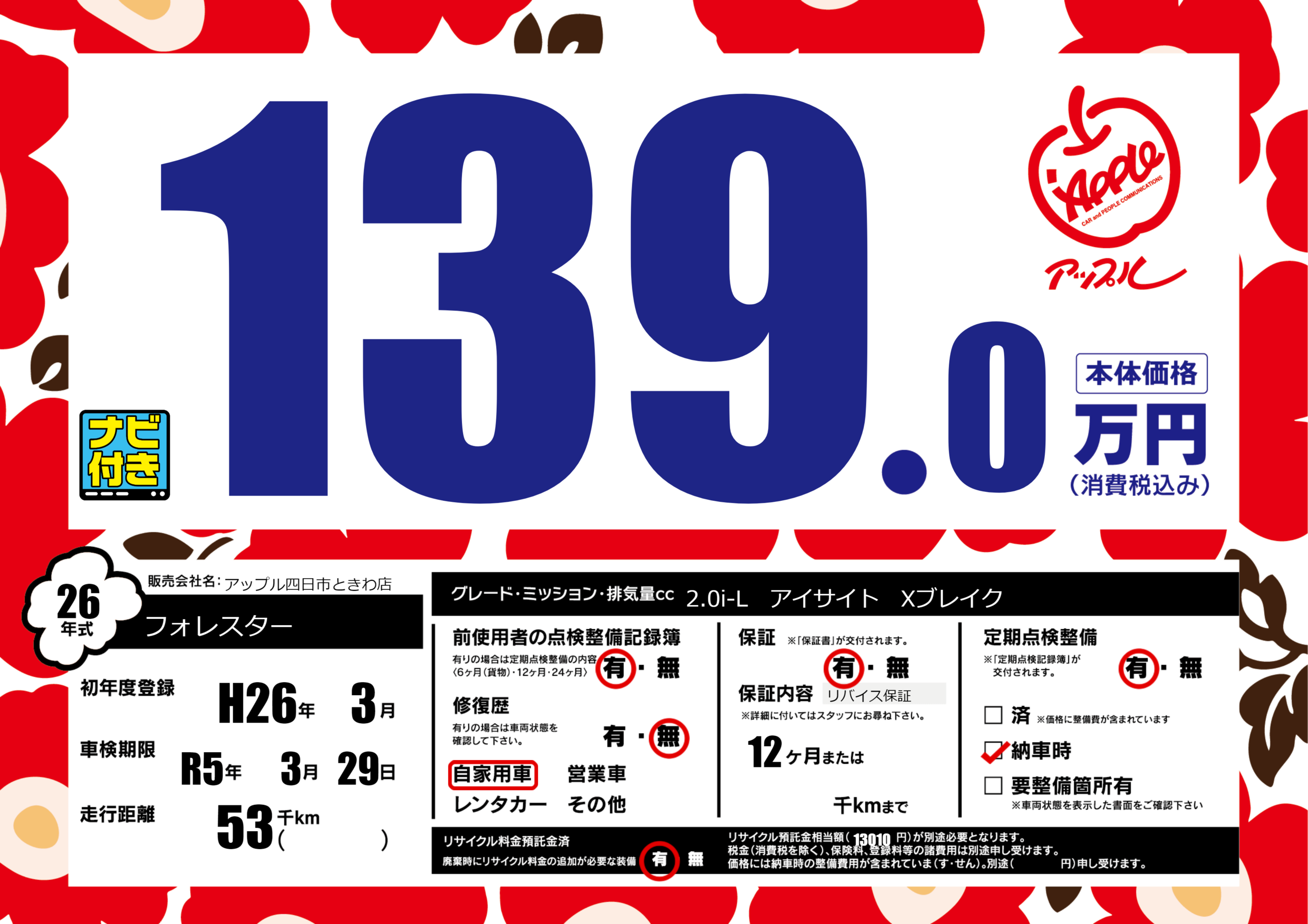 | 走行キロ | 5.3万km | 初年度登録 | H26年3月 |
