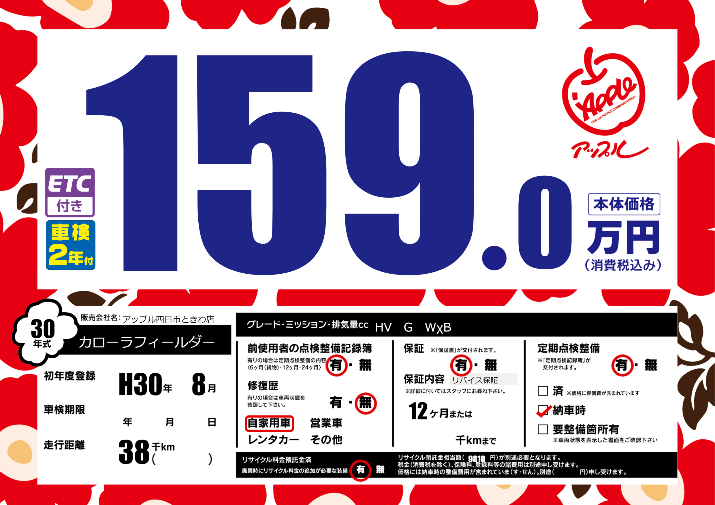 | 走行キロ | 3.8万km | 初年度登録 | H30年8月 |