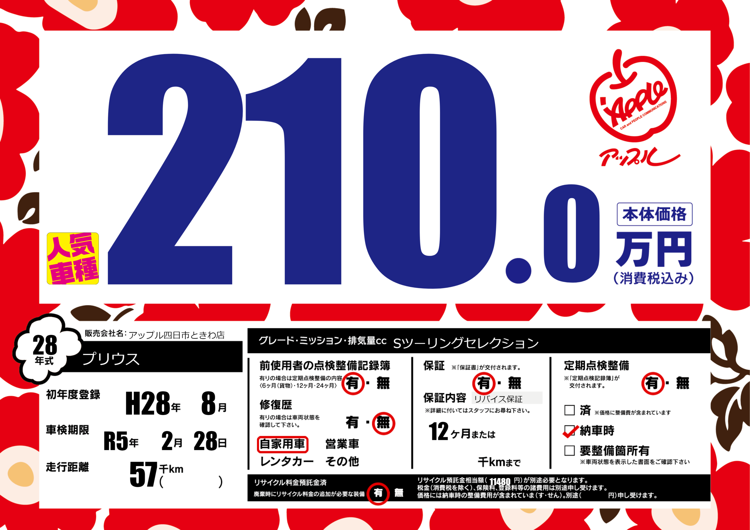 | 車名 | プリウス | グレード ミッション 排気量 |